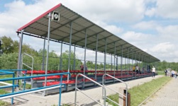 Stadion w Trawnikach zgodnie z informacjami na Google Maps nosi nazwę Boisko piłkarskie w Trawnikach . Ale ja będę używał nazwy Stadion . A więc stadion położony jest na krańcu miejscowości, w pobliżu torów kolejowych oraz zakola Wieprza. Posiada jedną zadaszoną trybunę liczącą trzy rzędy miejsc. Trybuna znajduje się na pewnym podwyższeniu względem boiska, co jest plusem, jeśli chodzi o widoczność, z kolei minusem jest fakt, że zadaszenie wspierane jest przez wiele słupków, które przesłaniają widok. W każdym razie, ja zapoznałem się z wygodami trybuny dopiero w drugiej połowie, ponieważ pierwszą postanowiłem oglądać jak prawdziwy fan futbolu, czyli na stojąco i po drugiej stronie boiska. Stoi sie tam dwa metry od linii bocznej, za niedużym ogrodzeniem wysokości 1 metra (w ten sposób oprócz mnie mecz oglądało jeszcze jakieś 30 osób). Stojąc w tym miejscu, udało mi się zrobić wiele udanych zdjęć i nabawić się oparzeń od słońca.