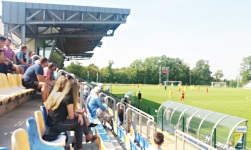 Na trybunie głównej zasiadł cały przekrój świdnickiego społeczeństwa, czyli rodzice z dziećmi, młodzież i ludzie w wieku okołoemerytalnym. Ku naszemu zdziwieniu, na znajdującej się naprzeciwko trybunie zwykle wyłączonej z użytku również zasiadało kilka osób. Nawet ku naszemu podwójnemu zdziwieniu, ponieważ w samo południe słońce promieniowało okrutnie i tamta trybuna była ostatnim miejscem, na którym chcielibyśmy się wtedy znaleźć. Nie byli to również goście (swoją drogą, klatka gości była tego dnia pusta), ponieważ z tego co mi się wydaje, któraś z tych osób miała na sobie żółto-niebieskie barwy. Cóż, zagadka pozostanie chyba nierozwiązana już na zawsze.