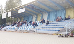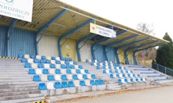 Wreszcie, możemy przejść do opisu właściwej trybuny. Liczy ona oficjalnie 264 miejsca siedzące, jest dość wysoka, a przede wszystkim - jest to solidna betonowa konstrukcja, zadaszona równie solidnym blaszanym dachem. Konstrukcja dachu jest bardzo fajna, przede wszystkim dlatego, że całe jego podparcie znajduje się z tyłu trybuny, stąd widzom nie przesłaniają widoku żadne słupki ani filary. Na trybunie znajduje się 6 rzędów krzesełek - 3/4 tych krzesełek to krzesełka z wysokimi oparciami, 1/4 to mniej wygodne siedziska bez oparć (na starszych zdjęciach znalezionych w Internecie w miejscu siedzisk znajdują się normalne krzesełka - czyżby tamten sektor posłużył jako źródło zapasowych krzesełek?). Na minus należy ocenić fakt, że trybuna oddalona jest od boiska o co najmniej 10 metrów. Nigdy nie potrafię zrozumieć tego rodzaju zabiegów. Po bokach trybuny znajdują się kilkumetrowe estetyczne tuje, które przy okazji mogą przesłaniać pole karne w przypadku gdy ktoś zajmie nieodpowiednie miejsce na trybunie. Z kronikarskiego obowiązku wspomnę na koniec, że na stadionie nie ma tablicy wyników.