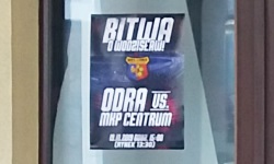 Dzień wcześniej miały miejsce unikalne na skalę światową derby Odra Wodzisław Śląski vs Odra Wodzisław Śląski. To jest całkiem ciekawa historia - otóż po upadku oryginalnej Odry Wodzisław dzieła odbudowy klubu podjęli się zarówno kibice (MKS Odra), jak i miasto (MKP Odra Centrum). Z różnych przyczyn, które próbowałem zrozumieć, czytając długie artykuły na Weszło (i których ostatecznie nie zrozumiałem), obydwie Odry ostatecznie nie dogadały się co do połączenia sił i obecnie grają w tej samej lidze. I właśnie dzień przed moim przyjazdem do Wodzisławia Śląskiego miały miejsce 3. derby Wodzisławia Śląskiego. Kibice MKS Odra ogłosili wielką mobilizację na ten mecz, a całe miasto było obklejone plakatami. Dosłownie na każdym przystanku, na każdym słupie ogłoszeniowym i na każdej ścianie, która się do tego nadawała, były przyklejone plakaty. Wziąłem sobie jeden z nich na pamiątkę. Co ciekawe, po drodze widziałem też trzy plakaty zapraszające na mecz kobiecego klubu SWD - tych nie brałem, ponieważ ewidentnie były one wielokrotnego użytku (organizatorzy doklejali do nich sukcesywnie nowych przeciwników i nowe daty).
