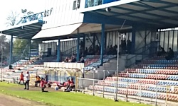 Do opisania została więc główna trybuna - trybuna ta składa się z dziewięciu rzędów krzesełek - dość standardowych siedzisk z niewysokimi oparciami umieszczonych na betonowych stopniach trybuny. Trybuna jest prawie w całości zadaszona (na brzegu ostał się jakiś niezadaszony sektor); dach jest osadzony dość nisko, za to mocno na plus należy ocenić to, że podparty jest z tyłu i po bokach, tzn. nic nie przesłania boiska (chyba, że ktoś usiadłby na samym jej skraju - wtedy mogłyby występować problemy z widocznością). Dach chyba osłania całą trybunę przed deszczem, ale jeśli chodzi o październikowe słońce (ktoś może jest tu fanem geografii i pamięta jak się liczy wysokość górowania słońca?), to oczywiście tylko w ostatnich rzędach można było się przed nim schować. Trochę lepszy standard jest na VIP-ach, gdzie trybuna jest lekko wysunięta i podwyższona względem miejsc dla plebsu, a zasiadający na niej widzowie mogą korzystać dodatkowo z zalet pochyłego daszku z pleksy, który nieco lepiej chroni przed słońcem. Z tego jednak, co udało mi się podpatrzeć, standard samych krzesełek chyba niczym nie różnił się od tego, czym dysponowałem ja na swojej trybunie (oczywiście nie byłoby żadnego problemu w tym, żeby oglądać mecz z perspektywy VIP-ów, po prostu zdecydowałem się siedzieć na standardowym sektorze). Nad VIP-ami znajdowała się jeszcze jedna kondygnacja, gdzie m.in. urzędował spiker - ale o tym raczej w kolejnej sekcji.