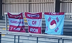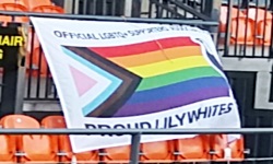 Dla tych, którzy nie lubią pikniku i preferują bardziej old-schoolowe klimaty, też było coś odpowiedniego - otóż na trybunach zabramkowych wisiały flagi. Dość nietypowe, ponieważ za bramką Tottenhamu (nazywam ją bramką Tottenhamu , ponieważ tam Koguty grały podczas pierwszej połowy) wisiała tęczowa flaga z podpisem Official LGBTQ+ Supporters Community - Proud Lily Whites (osobiście... nie rozumiem tego, bo czy to jest w ogóle jakiś istotny wyróżnik grupy społecznej, żeby aż wywieszać flagę? ktoś zbiera znaczki, ktoś kocha osoby tej samej płci, nic mi do tego choć z drugiej strony, patrząc na to, co spotkało np. Turinga, takie deklaracje mogą być ważne). Z kolei za bramką Młotów wisiały trzy flagi w barwach West Ham - Women of Iron , Longhurst - Claret & Blue Blood (Longhurst - piłkarka West Ham, Claret - bordowy po angielsku, przyp. chom.) oraz flaga Korei Południowej w kolorach bordowo-niebieskich z podpisem Cho (też piłkarka WHU). Wszystkie w tej samej kolorystyce, o tych samych rozmiarach - czyli wyprodukowane przez tę samą firmę i można je podciągnąć pod materiały promocyjne West Hamu. Generalnie klimat związany z flagami był nieco inny niż w Polsce, choć domyślam się, że w naszym kraju budziłyby całkiem duże zainteresowanie i pewnie szybko zostałyby przez kogoś zdobyte .