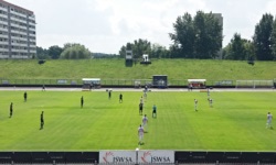 Stadion w Jastrzębiu-Zdroju to obiekt starszego typu - boisko jest otoczone szeroką bieżnią (nie wiem czemu, wyasfaltowaną), a dookoła niej znajduje się wysoki ziemny wał - jego połowa znajdująca się od północnej strony boiska przeznaczona jest na trybunę. Jako osobie źle znoszącej słońce (poparzenia słoneczne, udary słoneczne i takie tam) nie przypadł mi do gustu fakt, że trybuny są skierowane na południe, szczególnie, że tego dnia było bezchmurne niebo i jakieś 28'C pogoda też nie sprzyjała grze w piłkę. A położony pośrodku trybuny sektor to była już totalna patelnia, ponieważ wszystkie ustawione na nim krzesełka były w kolorze doskonałej czerni (nie jakiś wyblakły szajs, tylko właśnie doskonała czerń, albedo 1%).