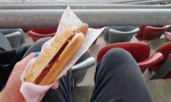 Z racji tego, że zasłyszałem to i owo o jakości jedzenia na Narodowym, postanowiłem osobiście wyrobić swoje zdanie na ten temat i kupiłem sobie hot-doga za 13PLN. I przyznaję, że legendy mówiły prawdę - letnia, niezbyt dobra parówka, w suchym pieczywie, które na dodatek jest całkowicie przekrojone, dzięki czemu w trakcie jedzenia wycieka z niego większość ketchupu. Ale muszę przyznać, że otrzymałem go w 10 sekund od złożenia zamówienia, co w przypadku takiej imprezy masowej... jest chyba bardziej kluczowe niż sam smak.