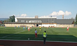 Stadion Miejski w Nowym Targu dość oryginalnie nosi imię Marszałka Jóżefa Piłsudskiego (nie prowadzę oficjalnych statystyk, ale jest to chyba najpopularniejszy z patronów odwiedzanych przeze mnie stadionów... i w sumie, ciężko się temu dziwić). Sam stadion nie jest zbyt imponujący i składa się z jednej trybuny ciągnącej się wzdłuż linii bocznej boiska - trybuna ta jest niewysoka, liczy w sumie 900 miejsc siedzących (szare krzesełka), częściowo jest zadaszona. Pomimo dość kameralnego charakteru obiektu na plus należy ocenić, że wspomniany dach nie ma żadnych podpórek przesłaniających widzom widok - cały jest podparty na słupach znajdujących się na tyłach trybuny. Na skraju trybuny znajduje się klatka gości, gdzie znajdują się wyłącznie barierki oraz miejsca stojące (co jest całkiem inteligentnym rozwiązaniem).