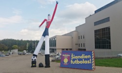 Można by pomyśleć, że skoro w sekcji Stadion napisałem już o pamiątkach oraz o spożytym kwasie, to już wyprztykałem się ze wszystkich tematów dotyczących atmosfery okołomeczowej i pozostaje mi już tylko napisać, ilu kibiców pojawiło się na stadionie. Otóż nie. Alytus jest bowiem jednym z tych nielicznych miejsc na futbolowej mapie Litwy, gdzie lokalna drużyna rzeczywiście budzi konkretne emocje. Już idąc przez całe miasto w kierunku mojego hotelu mijałem kilka reklam zapraszających na dzisiejszy mecz - składały się one z tablicy o treści Šiandien futbolas! i kilkumetrowego chwieja (tak to się podobno fachowo nazywa) w barwach Dainavy. Gdzieniegdzie w przestrzeni publicznej można było też zauważyć najprawdziwsze vlepy Dainavy.