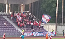 Nie wiem czemu, ale w Internetach nie ma oficjalnej informacji dotyczącej liczby kibiców na dzisiejszym meczu, dlatego oszacowałem ją wizualnie na ok. 500. Co się tyczy kibiców gospodarzy, na północnym skraju trybuny głównej znajdował się młyn - grupa kilkudziesięciu kibiców w czerwonych barwach, którzy wywiesili 2 flagi (Dainava Ultras oraz Dzūkų Tankai ) i całkiem wytrwale dopingowali swoją drużynę przez cały mecz. Wymachiwali flagami na kijach i śpiewali różne rzeczy, spośród których moja nikła znajomość litewskiego pozwoliła na zidentyfikowanie tylko jednego, najprostszego tekstu: Alytaus Dainava, siala-lala-la! (należy to śpiewać w rytmie któregoś tam hitu Boney M). Po meczu gospodarze świętowali wraz z piłkarzami zwycięstwo, śpiewając chyba ichniejszą wersję Kto wygrał mecz?