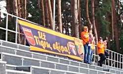 Na meczu obecni byli też kibice gości, w liczbie chyba 4. Ulokowali się na wspomnianej we wcześniejszej sekcji niezadaszonej metalowej trybunie, rozwinęli flagę Už tigrų, ekipą oraz jakąś drugą, pomniejszą, na której również znajdowało się odniesienie do przydomku Bangi Tigrai związanego z pomarańczowym kolorem koszulek (przy okazji, słowo banga w języku litewskim oznacza falę , co zapewne nawiązuje do faktu, że Gargždai znajdują się nieopodal Klaipėdy). Kibice mieli na sobie pomarańczowe barwy klubowe i ogólnie bardzo przyzwoicie reprezentowali swoją drużynę. Tak jak w przypadku Dainavy, mogę przytoczyć jedynie ich jedną piosenkę, tę najbardziej zrozumiałą: Gargždų Banga!
