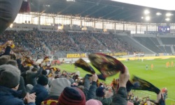 Jeśli chodzi o doping, chciałbym szczególnie wyszczególnić pewną piosenkę, którą kibice Pogoni przedstawili w drugiej połowie. Jej melodia nie była specjalnie odkrywcza (wszystko zostało odśpiewane w rytmie Go West autorstwa Pet Shop Boys Village People), ale została ona zaaranżowana w bardzo przejmujący teatralny sposób. Na początku tej aranżacji cały młyn siedział na swoich krzesełkach, podczas gdy sam gniazdowy przy akompaniamencie bębna śpiewał przez swoją krzykaczkę w kółko Powstań, jeśli kochasz Ją, powstań, jeśli kochasz Ją... . W końcu, po wielu nawoływaniach gniazdowego, cały młyn naraz powstał i odśpiewał: Kocham, Pogoń szczecińską! Dla Niej oddałbym wszystko! Serce, moje jedyne, Oddam swojej Drużynie!