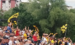W poprzednich sekcjach przypadkowo zdążyłem wspomnieć o istotnych elementach klimatu dzisiejszego meczu - że przed stadionem były rozdawane prawdziwe fizyczne wejściówki na mecz, a na stadionie byli kibice gości. Co do kibiców gości, na początku przechadzali się oni po trybunie głównej w swoich barwach (koszulki, szaliki, itp.) i wbrew pozorom, byli przyjmowani oni dość życzliwie. Koniec końców, zebrali się oni na nieoddanym jeszcze do użytku sektorze gości, ale gdyby pozostali na trybunie gospodarzy, do niczego zdrożnego by nie doszło. Na trybunach była też niezłomna Pani Grażyna, która co prawda siedziała w zupełnie innym sektorze niż ja, ale i tak bardzo dobrze ją było słychać, gdy wykrzykiwała raz po raz Brawooo! podczas wyczytywania składów przez spikera.