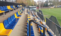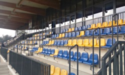 Naprzeciwko trybuny pó³nocnej znajduje siê du¿o mniej imponuj¹ca trybuna po³udniowa. Jest to doœæ standardowa konstrukcja, czyli 3 rzêdy ¿ó³to-niebieskich krzese³ek na prostej stalowej konstrukcji bez zadaszenia. Z racji tego, ¿e w trakcie meczu nie mo¿na siê przemieszczaæ z trybuny na trybunê (a przynajmniej nie mo¿na bez opuszczenia stadionu), trybuna jest uczêszczana jedynie przez fanów i pe³ni funkcjê m³yna. By³o wiêc dla mnie pewnym zaskoczeniem, ¿e zaledwie kilkanaœcie metrów obok znajduje siê... sektor goœci. Jeœli dobrze widzia³em, miêdzy ogrodzeniem trybuny gospodarzy (ogrodzony obszar obejmuje poza sam¹ trybun¹ równie¿ du¿y kawa³ek zieleni) a klatk¹ goœci znajduj¹ siê ca³e 2 metry bufora, co z pewnoœci¹ sprzyja wzajemnemu obrzucaniu siê z ewentualnymi przyjezdnymi ró¿nymi inwektywami i przedmiotami. Ciekawostk¹ jest, ¿e od zachodniej strony boiska znajduje siê bardzo du¿y plac zieleni, na którym zupe³nie nic nie ma. Po prostu... b³onie.