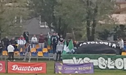 Przyznam szczerze, ¿e wybieraj¹c siê na mecz do B³onia (a tym bardziej na mecz z Pelikanem), nie spodziewa³em siê ¿adnych wielkich kibicowskich klimatów (istnieje co prawda takie coœ jak Równina £owicko-B³oñska, ale jakoœ nikt z tego powodu nie nazwa³ meczu derbami ). A tu proszê - na trybunie po³udniowej pojawi³a siê ok. 30-osobowa grupa kibiców z flag¹ KS B£ONIANKA oraz flagami Nigerii zielono-bia³o-zielonymi machajkami. Jeszcze przed pierwszym gwizdkiem rozwinêli oni równie¿ miniaturow¹ sektorówkê (czarn¹ flagê z bia³ym napisem o treœci... PATOLOGIA ), pod któr¹ schowa³o siê kilku kibiców celem odpowiedniego przysposobienia siê do odpalenia pirotechniki. Ju¿ w 3. minucie meczu odpalili kilka rac oraz bia³o-zielonych œwiec dymnych, a potem prowadzili doœæ wytrwa³y doping wraz z machaniem flagami przez ca³¹ 1. po³owê. W drugiej po³owie doping by³ du¿o bardziej spokojny i ruszy³ tak naprawdê dopiero w 65. minucie, co mog³o mieæ zwi¹zek z wizyt¹ na sektorze funkcjonariuszy policji, którzy chyba wypisywali kibicom mandaty (?).