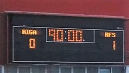 Najbardziej natomiast urzekająca jest znajdująca się na ścianie hali tablica świetlna, która przywodzi na myśl Familiadę . Te świecące na żółto żaróweczki powkręcane w czarną tablicę wyglądają wprost przepięknie i jest to rozwiązanie 100 razy lepsze niż wyświetlanie wyniku na telebimie (choć gdyby postawiono jakiś telebim za bramką południową, wyszłoby to chyba stadionowi na plus). To, co mnie mocno zastanawia w tej tablicy to fakt, że pola do wyświetlania nazw drużyn są dość wąskie - o ile akurat dzisiaj napisy RIGA oraz RFS spokojnie się tu zmieściły, o tyle zastanawia mnie, co jest tu wyświetlane, kiedy gra... reprezentacja, co przecież się zdarza. Chodzi o to, że na pierwszy rzut oka napis LATVIJA chyba się tu nie mieści - ale chciałbym się mylić, bo wprost nie wierzę, że ktoś zaliczył tak spektakularną wtopę.