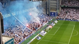 Przed pierwszym gwizdkiem kibice obydwu drużyn zdążyli odpalić też race - w przypadku gospodarzy było to trochę rac oraz niebieskie i białe świece dymne, z kolei goście zaprezentowali najpierw oprawę z kartoniadą, a następnie racowisko z pomniejszą sektorówką z herbem klubu (przebierali się pod nią?) i transparent o treści OG VI ELSKER AGF! (oznacza to chyba mniej więcej my kochamy AGF! ). W trakcie samego meczu gospodarze ograniczali się już tylko do machania flagami, podczas gdy goście kilka minut po golu wyrównującym na 2:2 zaprezentowali kolejne racowisko. Kibice obydwu drużyn prowadzili głośny, żywiołowy doping, ale oczywiście ciężko mi tutaj cokolwiek zacytować, pomijając te momenty, kiedy śpiewali o poszczególnych piłkarzach (np. Di-io-go, Di-io-go, Di-io-go! Di-io-go Gonçalves, Di-io-go! , zapomniałem jednak, w jakim rytmie wyśpiewywano imię i nazwisko Mohammeda Daramy'ego). No i oczywiście, kibice gospodarzy raz na jakiś czas brali się do skoordynowanego podskakiwania po swojej trybunie. Nie jest to oczywiście nic wyjątkowego i nie byłaby to rzecz warta podkreślenia, gdyby nie fakt, że za każdym razem przy tej okazji na telebimach wyświetlano komunikat o treści Koordineret hop paa B-tribunen er ikke tilladt .