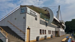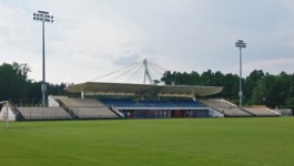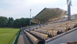 Centrum pobytowe Miejski Obiekt Sportowy w Sulejówku to bardzo fajny obiekt, który jak dla mnie spokojnie nadawałby się na drugą ligę. Stadion składa się z jednej trybuny liczącej oficjalnie 1240 miejsc siedzących. Krzesełka na trybunie są w kolorach niebieskim i mocno już wyblakłym żółtym (w każdym razie, na żywo nie wygląda to tak fajnie jak na stronie klubu) - są one całkiem porządne, bo składane choć przydałoby się je trochę wyczyścić. Centralna część trybuny objęta jest zadaszeniem podwieszonym w dość fantazyjny sposób na górującym nad trybuną pylonie. Trybuna jest dość wysoka, w każdym razie, widoczność z sektorów położonych wyżej jest bardzo dobra.