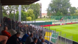 Jeśli chodzi o kibiców gospodarzy, miałem wrażenie, że na pikniku panowało lekkie rozczarowanie faktem, że nie udało się przejść barażu z Motorem Lublin i w sezonie 2023/24 nadal jest tu 2. liga. Sam młyn też był nieco przerzedzony, bo za biało-niebieską flagą KOTWICA KOŁOBRZEG znajdowało się jakieś 100-150 kibiców. Niemniej, gospodarze rozpoczęli doping od jednoznacznej deklaracji, śpiewając: Kotwica, jesteśmy z Tobą, nie opuścimy Cię!Nigdy Cię nie zdradzimy, bo my kochamy Cię!
