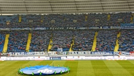 No dobra, to teraz może coś o samym Stadionie Śląskim... jest to nowoczesny stadion z 55 tysiącami miejsc siedzących. Niestety, jest to również stadion wielofunkcyjny, co oznacza, że znajduje się na nim szeroka bieżnia, jakieś rozbiegi do skoku w dal i inne tego typu elementy, które powodują, że odległość trybun od linii bocznej w niektórych miejscach przekracza 25 metrów. Jednocześnie, widoczność z trybun jest całkiem dobra, szczególnie kiedy zasiada się na wyższym pierścieniu. Stadion jest bardzo estetyczny zarówno od zewnątrz jak i od wewnątrz; od wewnątrz odpowiada za to niebieska kolorystyka krzesełek na trybunach oraz bieżni (wraz z dodatkowymi żółtymi akcentami, dzięki czemu całość nawiązuje do flagi Ukrainy Śląska). Od zewnątrz za estetykę odpowiada znajdujący się na stadionie tzw. ring główny (o, wreszcie wygooglowałem jakieś mądre słowo, które doda tej sekcji wrażenia profesjonalizmu), na którym zawieszone jest poszycie dachowe z poliwęglanu (czymkolwiek to jest). Nie znam się zupełnie na architekturze, ale konstrukcja dachu jest ponoć dość oryginalna, a jego powierzchnia sprawia, że jest to prawdopodobnie największy tego typu dach w całej Europie (choć w trakcie budowy był on źródłem problemów - w 2011 złożył się on podczas instalacji na koronie, co wydłużyło czas oddania stadionu do użytku o co najmniej parę lat).