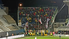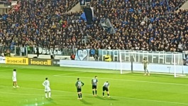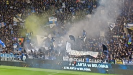 Jeśli chodzi o młyn gospodarzy, Curva Nord była dziś pełna, co oznacza dobre kilka tysięcy gardeł. I rzeczywiście, kiedy wszyscy kibice Atalanty zaczynali śpiewać, uderzenie było konkretne. Niestety, ze względu na barierę językową, nie jestem w stanie przytoczyć zbyt wiele przyśpiewek (co więcej, na nic mi się nie przydał fakt, że znałem już słowo Vaffanculo , bo dzisiejszego dnia ono chyba nie padło). Na trybunie wisiało wiele flag, a największymi były te o treści ATALANTA FACCI SOGNARE oraz VECCHIA GUARDIA . Kibice przez cały mecz machali różnymi flagami (to chyba włoski standard jeśli chodzi o kibicowanie), a po golu na 1:0 odpalili nawet kilka rac, które dawały dużo więcej dymu niż światła (to też jest chyba standard we Włoszech). Jeśli chodzi z kolei o kibiców gości, wypełnili oni zdecydowaną większość swojego sektora i również poobwieszali go różnego rodzaju flagami, a także przez cały mecz prowadzili doping i machali flagami-machajkami. Co ciekawe, w przeciwieństwie do wczorajszego meczu, tym razem nie mieliśmy żadnych flag o treści Curva Nord , pomimo tego, że fanatycy obydwu grających dziś drużyn zajmują właśnie północne trybuny na swoich domowych stadionach.