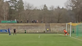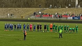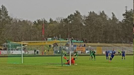 Na dzisiejsze derby województwa lubuskiego piłkarze wystroili się dość specyficznie, ponieważ Carina zagrała na zielono, a Stilon na niebiesko. Oczywiście, rozumiem, że są to podstawowe barwy obydwu tych drużyn, ale jednocześnie kolory te są do siebie na tyle podobne, że czasami miałem problem z rozróżnianiem piłkarzy i ze zrozumieniem tego, co dzieje się na boisku (disclaimer - nie jestem daltonistą). Od samego początku meczu na boisku przeważali, a pierwszą dobrą okazję mieli oni już w 8. minucie, gdy jeden z piłkarzy Stilonu z bliska oddał niecelny strzał głową (bramkarz Mateusz Kustosz krzyknął tylko do swoich obrońców Kurwa mać! , bo napastnik zbyt łatwo doszedł do tej sytuacji). Z kolei w 11. minucie obrońca Cariny zbyt łatwo dał się wyprzedzić w polu karnym Emilowi Drozdowiczowi, po czym w głupi sposób odepchnął go, co poskutkowało karnym dla Stilonu. Rzut karny bezbłędnie wykonał Adrian Łuszkiewicz.
