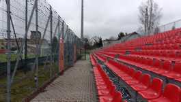 A więc stadion składa się aktualnie z dwóch trybun - z trybuny prostej (położonej od zachodniej strony boiska), która jest w pełni zadaszona i całkiem estetyczna (dzięki wykończeniu tego zadaszenia drewnem). Jest ona jednocześnie dość ciasna - zarówno niezbyt wysoka, jak i położona bardzo blisko boiska (z tego co widzę, pomiędzy pierwszym rzędem a bandami reklamowymi jest zaledwie wąski chodnik). W centralnej stronie trybuny znajduje się na niej pewnego rodzaju dobudówka z przeszkloną ścianą, która prawdopodobnie pełni funkcję loży VIP (tak przynajmniej strzelam, bo nie chciało mi się tego weryfikować). Drugą trybuną jest południowa trybuna zabramkowa - jest to typowa metalowa konstrukcja. Nie jest ona zadaszona, ale jest wyższa od trybuny prostej, dzięki czemu z najwyższych rzędów wszystko widać całkiem nieźle. Wszystkie krzesełka na stadionie są w kolorze czerwonym. Z innych istotnych elementów, na stadionie znajduje się jeden telebim (w rogu boiska) i cztery maszty oświetleniowe. Na stadionie nie było sektora gości, choć goście z Gliwic i tak zostali nieoficjalnie zaproszeni na skrajny sektor trybuny zabramkowej. Po spadku do I ligi w Niepołomicach zalegalizowano tę praktykę, ponieważ sektor ten został ogrodzony i od tego czasu funkcjonuje już oficjalnie jako miejsca dla gości.