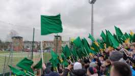 Kibice przez cały mecz prowadzili fajny doping, składający się jednak głównie z różnego rodzaju krótkich zawołań. Jeśli chodzi o dłuższe piosenki, najbardziej istotną istotną była przyśpiewka określona przez gniazdowego mianem hymnu - ale przyznam, że była ona jak dla mnie niezbyt ciekawa i niezbyt melodyjna i niewiele z niej zapamiętałem (stwierdziłem, że na potrzeby tej relacji sprawdzę sobie jej treść już po meczu, w Internecie - ale o dziwo, Internet nic o tej piosence nie wie). W ogóle muszę przyznać, że będąc na trybunie tak wciągnąłem się w kibicowanie Puszczy, że niewiele tego dnia zanotowałem, więc nie mam nic konkretnego do zacytowania w tej sekcji. Z istotnych informacji, mogę dodać, że na skraju trybuny znajdowała się grupa kibiców Piasta, która (jak wspomniałem w poprzedniej sekcji) została ugoszczona przez Puszczę, ponieważ na stadionie nie było żadnego oficjalnego sektora gości.