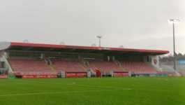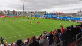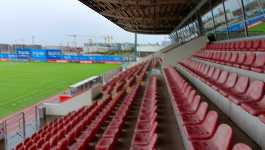 No dobra, a co z samym stadionem? Trybuna prosta składa się z jednolitych czerwonych krzesełek i liczy ok. 1200 miejsc siedzących. Na stadionie na szczęście nie ma bieżni, stąd trybuna znajduje się w bliskiej odległości od boiska. Trybuna jest w pełni zadaszona. Naprzeciw trybuny znajduje się dziwna budka z dwoma wąskimi prostokątnymi okienkami, co do złudzenia przypomina wielką tablicę wyników. NIe jest to jednak tablica wyników (choć być może kiedyś była), a stanowisko kamerzysty. Właściwa tablica wyników znajduje się za południową bramką - trochę konsternujący był fakt, że po jej obydwu stronach znajdowały się reklamy... KFC. Sport i fast food, każdy wie, że to idzie z sobą w parze (chyba, że reklama jest adresowana do tłustych pikników takich jak ja, wtedy to w sumie ma sens). A propos reklam, boisko z trzech stron jest dość szczelnie otoczone różnego rodzaju banerami reklamowymi, które skutecznie uniemożliwiają potencjalne obejrzenie meczu za darmo (a szczególnie dobrze by to wychodziło za trybuną zabramkową, ponieważ tamtejszy chodnik znajduje się kilka metrów powyżej poziomu boiska. Na boisku znajduje się w zasadzie obowiązkowa na tej szerokości geograficznej sztuczna murawa oraz standardowe islandzkie sztuczne oświetlenie o standardzie polskiej okręgówki (wyjątkowo nie miałem okazji zobaczyć jak się ono sprawuje, ponieważ ten mecz miał miejsce o 14:00 czasu lokalnego).