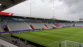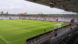 W oficjalnej aplikacji UEFA Ticketing (niestety, aktualnie jedynym sposobem dystrybucji biletów przez UEFA jest gówniana apka... choć na szczęście trzeba przyznać, że jak na apkę nie jest ona aż tak gówniana) stadion oznaczony jest jako Arena Thun i właśnie tak określiłem miejsce rozgrywania meczu w nagłówku posta. Oficjalną nazwą stadionu jest natomiast Stockhorn Arena . Nie wiem czemu UEFA wygumkowała taką piękną nazwę, przecież to nawet nie jest nazwa żadnej firmy, tylko malowniczego szczytu położonego w odległości kilku kilometrów od miasta Thun. Zarys tego szczytu znajduje się na froncie stadionu i stanowi on pewnego rodzaju logo obiektu.