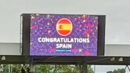 Po dotarciu pod Arena Thun/Stockhorn Arena udałem się w kierunku stoiska z oficjalnymi pamiątkami UEFA, ale po zapoznaniu się z cenami stwierdziłem, że tego dnia pozostanę neutralnym widzem w neutralnych barwach, który tego dnia chce po prostu popatrzeć na dobry futbol (bez ironii - reprezentacja Hiszpanii to była zdecydowanie najbardziej spektakularnie grająca drużyna na WEURO 2025). Gdy tak przechadzałem się pod stadionem, załapałem się na darmowe lody ze stoiska Lidla; co prawda po otworzeniu pudełeczka okazało się, że to nie lody, a owocki, ale za darmo i owocki dobre (tym bardziej, że obiektywnie były smaczne). Poza tym, miałem okazję zobaczyć większą grupę kibiców reprezentacji Hiszpanii, którzy przemaszerowali z centrum miasta na stadion wymachując flagami i śpiewając coś tam w swoim języku (którego nie jestem zbyt wielkim entuzjastą). Moje łażenie dookoła stadionu zakończyło się dość nagle i nieoczekiwanie, kiedy obejrzałem się w stronę zachodnią (w stronę m.in. szczytu Stockhorn) i stwierdziłem, że część horyzontu zakrywa biała ściana wody sunąca w naszą stronę. Ustawiłem się w kolejce do wejścia na trybunę i udało mi się znaleźć pod dachem zanim wszystko się zaczęło.