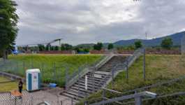 Naprzeciwko trybuny wschodniej znajduje się zachodnia trybuna prosta. Jest ona znacznie większa od trybuny wschodniej (szacuję, że liczy ona jakieś 2-2,5 tysiąca miejsc siedzących) i nie jest ona aktualnie użytkowana w trakcie meczów (a przynajmniej nie w trakcie dzisiejszego). Mimo to, trybuna wygląda jakby była w całkiem niezłym stanie - są na niej wszystkie krzesełka, a te białe tworzą na tle jasnoniebieskich napis GÓRNIK . Na jednym z ciągów komunikacyjnych jest też wymalowany herb Górnika. Na trybunie nie ma żadnego zadaszenia. Co ciekawe, w trakcie meczu pojawiło się na niej kilkanaście osób, ale nie wiem w jaki sposób się tam znalazły (w każdym razie, wszystko wskazuje, że nie płaciły one za wstęp). Z innych informacji na temat stadionu - znajduje się na nim niezbyt imponująca tablica wyników (pozwalająca na wyświetlanie jedynie wyniku i czasu), za to nie ma na nim sztucznego oświetlenia. Zaskoczyło mnie, że przed meczem nie była puszczana żadna muzyka - nie wiem czy to jest tutaj standard, czy jednorazowy przypadek, w każdym razie przywitałem ten fakt z ulgą (muzyka puszczana na stadionach z reguły należy do gatunków o działaniu kancerogennym).