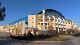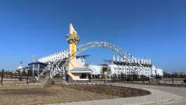 Za bramką północną znajduje się trybuna zabramkowa, która jest nieco wyższa - naliczyłem na niej jakieś 12 rzędów siedzeń. To na tej trybunie znajduje się młyn kibiców gospodarzy (przy okazji, kibice przyjezdni zasiedli na skraju jednej z trybun prostych, a od reszty kibiców oddzielało ich paru ochroniarzy, co jest chyba typowym rozwiązaniem w Mołdawii). Gdy wspiąłem się na szczyt tej trybuny okazało się, że za nią znajduje się też mała hala sportowa, z własnymi małymi trybunkami (jednak po tych wszystkich cudach nie zrobiło to na mnie już większego wrażenia). Bramka południowa jest jedyną, za którą nie ma trybuny - zamiast tego, mamy tam ścianę czterokondygnacyjnego budynku, który o ile dobrze zrozumiałem, jest hotelem. Pośrodku najwyższej kondygnacji znajduje się imponujący telebim. Dach też jest całkiem imponujący - jest to wysoka łukowata konstrukcja, która sprawia, że cała hala ma w przybliżeniu kształt półwalca. Dach sięga podobno wysokości 37 metrów, co sprawia, że granie na tej hali w piłkę nożną ma sens, bo da się tu nawet posłać lagę, nie trafiając futbolówką w sufit.