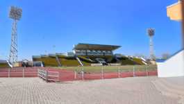 Moje zwiedzanie kompleksu Sheriffa rozpoczęło się od przejścia przez południową bramę, gdzie... od razu zatrzymał mnie ochroniarz. Nie wiem, czy wynikało to bardziej z chęci skontrolowania mnie, czy z chęci pomocy, w każdym razie moje wytłumaczenia go usatysfakcjonowały i sam również wytłumaczył mi, którędy powinienem iść, aby dostać się do sklepiku Sheriffa. Udałem się więc w tamtą stronę i pierwszym mijanym przeze mnie obiektem była tzw. Główna Arena - jest to obiekt stricte piłkarski (bez bieżni), składający się z czterech nieco kanciastych trybun. Trybuny są w pełni zadaszone i pokryte są głównie żółtymi krzesełkami, na których dodatkowe czarne krzesełka tworzą napis Sheriff . Pojemność stadionu to prawie 13 tysięcy miejsc siedzących i jest to obiekt, na którym Sheriff podejmował choćby Real Madryt w Lidze Mistrzów w sezonie 2021/22. Niestety, poza jedną możliwością zerknięcia przez szczelinę w bramie, stadion mogłem oglądać głównie z zewnątrz - jeśli chciałbym go zobaczyć od środka, musiałbym zarezerwować sobie wycieczkę z przewodnikiem. A dzisiejszy mecz nie odbywał się na tym obiekcie.