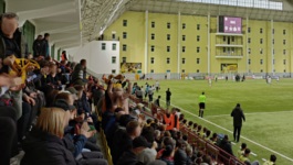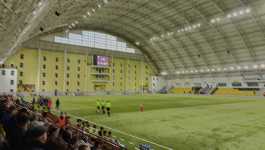 W końcu docieramy w tym opisie do właściwej areny dzisiejszego spotkania. A była nią... hala z pełnowymiarowym boiskiem. I to nie żadna hala pneumatyczna (tzw. balon ) - otóż naddniestrzańscy oligarchowie z koncernu Sheriff dosłownie postawili sobie budynek mieszczący pełnowymiarowe boisko. I jest to naprawdę imponująca konstrukcja. Z zewnątrz wygląda ona... po prostu dziwnie, gdybym nie wiedział co jest w środku, wziąłbym ją zapewne za lodowisko (prawdopodobnie za sprawą niebieskiego dachu, który powoduje pewien przekaz podprogowy ). Ciekawiej jest jednak od wewnątrz. Przede wszystkim, mamy tutaj boisko (pełnowymiarowe - pamiętacie jeszcze), które pokryte jest naturalnie sztuczną murawą, podobno najwyższej jakości. Boisko otoczone jest z trzech stron trybunami - wzdłuż linii bocznych znajdują się dwie trybuny proste, na których znajduje się siedem rzędów krzesełek. Trybuny są jakieś 5 metrów od linii bocznej, dzięki czemu wszystko bardzo dobrze z nich widać. Szkoda tylko, że nie są one podniesione względem poziomu boiska - pierwszy rząd znajduje się na wysokości murawy. Dosyć zabawny jest fakt, że między boiskiem a trybuną mieszczą się jeszcze... ławki rezerwowych. Są one dosyć skromne i zapewne niewygodne - co więcej, siedzących na nich piłkarzy oddzielają od widzów jedynie niskie barierki (ale nie sądzę, że piłkarzom mogłoby coś zagrażać, bo poza standardowymi ochroniarzami na meczu było także kilku ludzi wyglądających jak naddniestrzańscy wojskowi). W sumie, siedzenia na hali również są raczej niewygodne - są to metalowe składane krzesełka, takie jakie czasem instaluje się na sektorach stojących, kiedy przy okazji jakiejś imprezy międzynarodowej przerabia się je tymczasowo na siedzące.