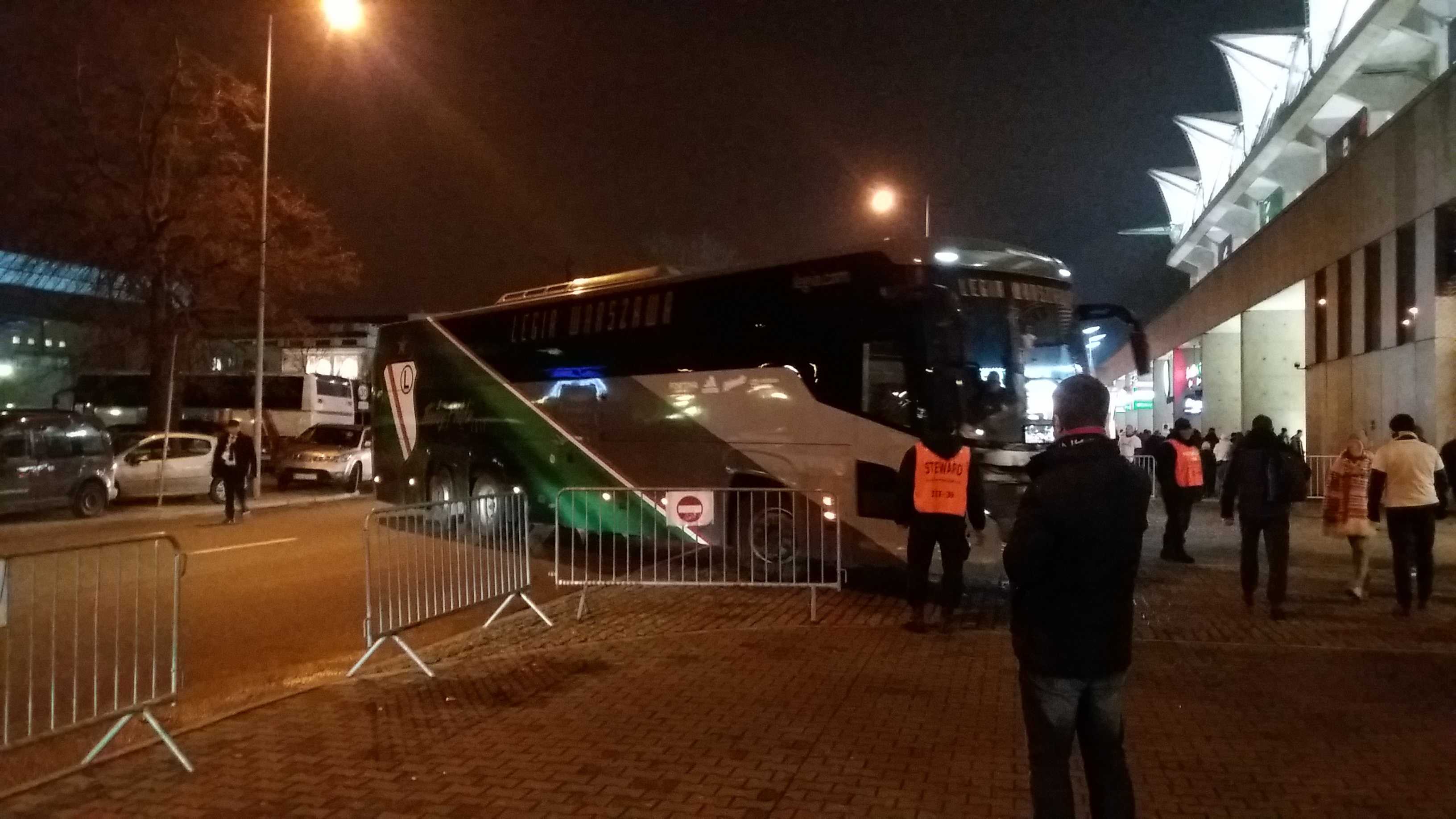 |  | | Autobus Legii wjeżdża na stadionowy parking | |