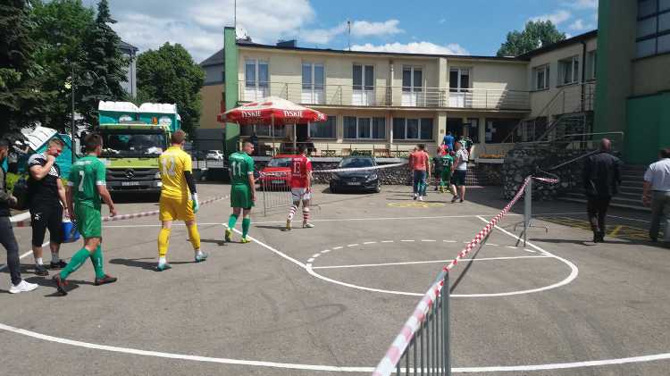 |  | | Aktorzy dzisiejszego spektaklu wychodzą na boisko | |