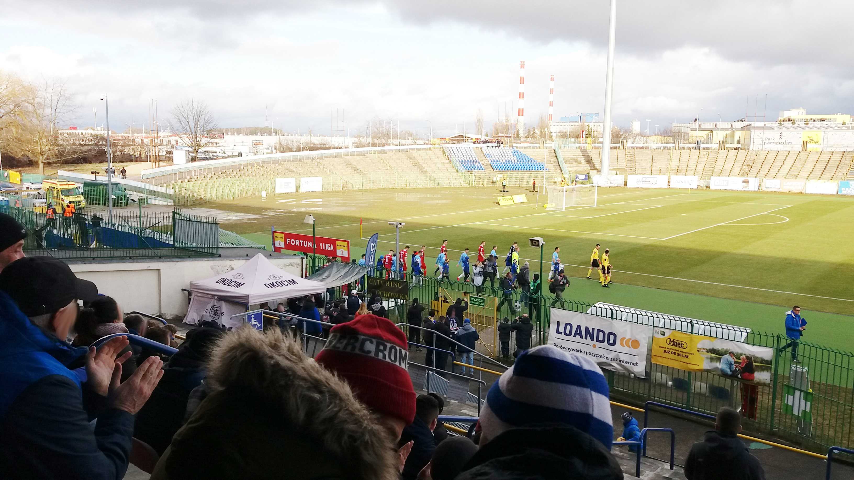 |  | | Piłkarze wychodzą na boisko. Nietypowo jak na polski stadion, bo od strony narożnika boiska | |