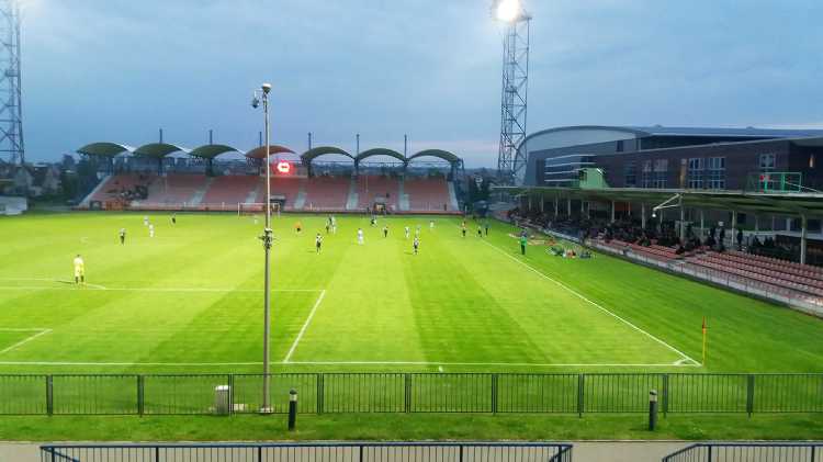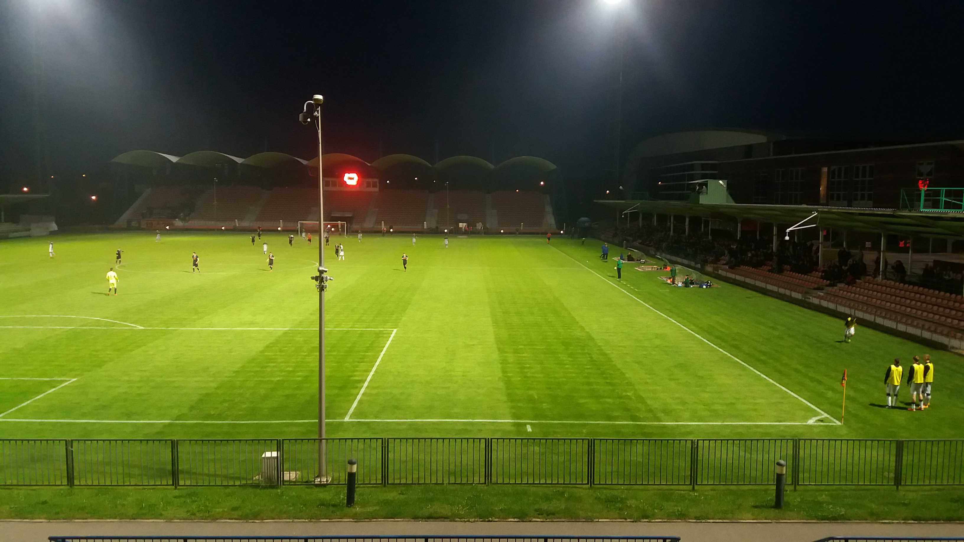 |  | | Widok na murawę z trybuny północnej. Jest wysoko. Na minus odległość od linii końcowej boiska | |