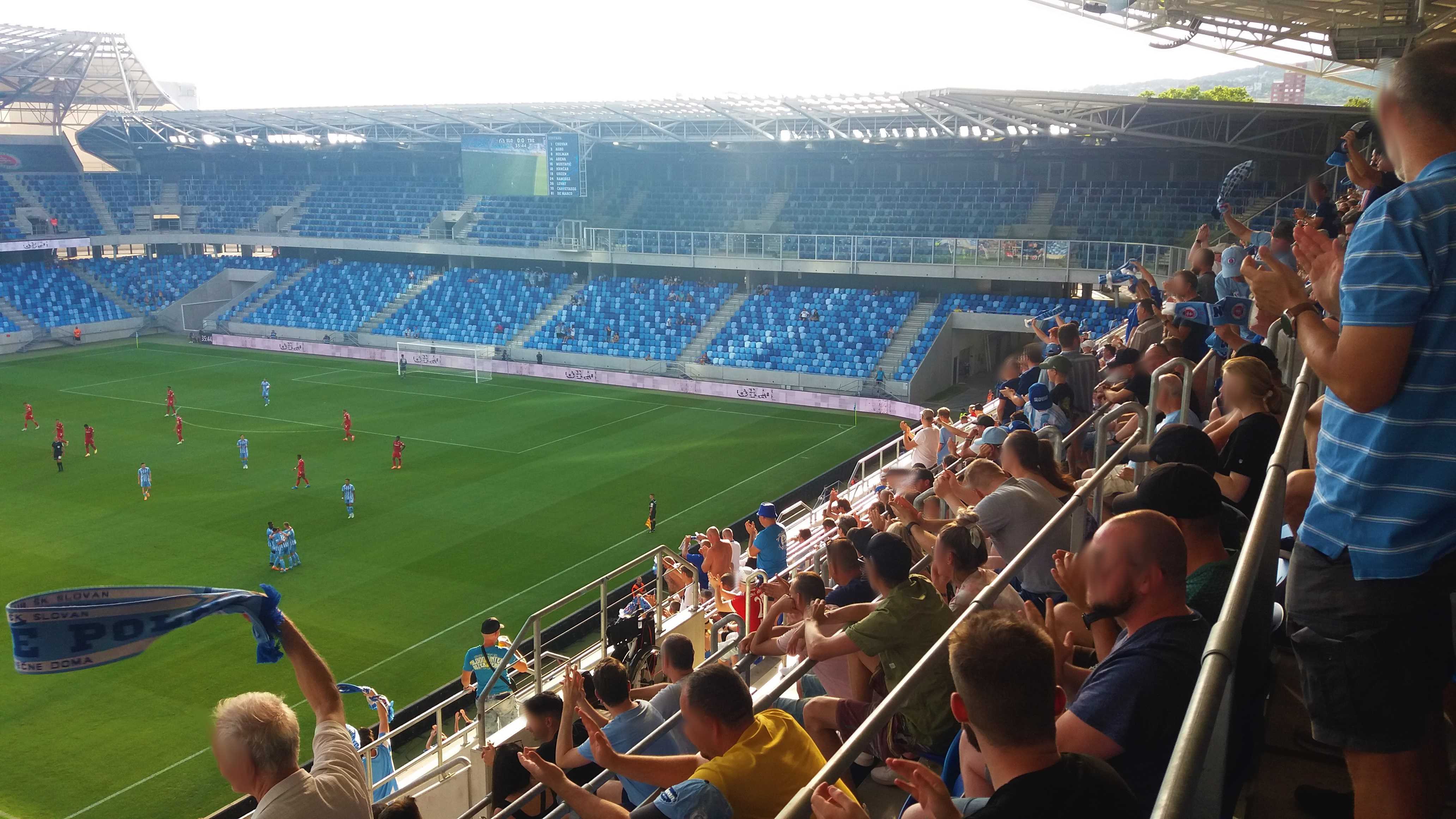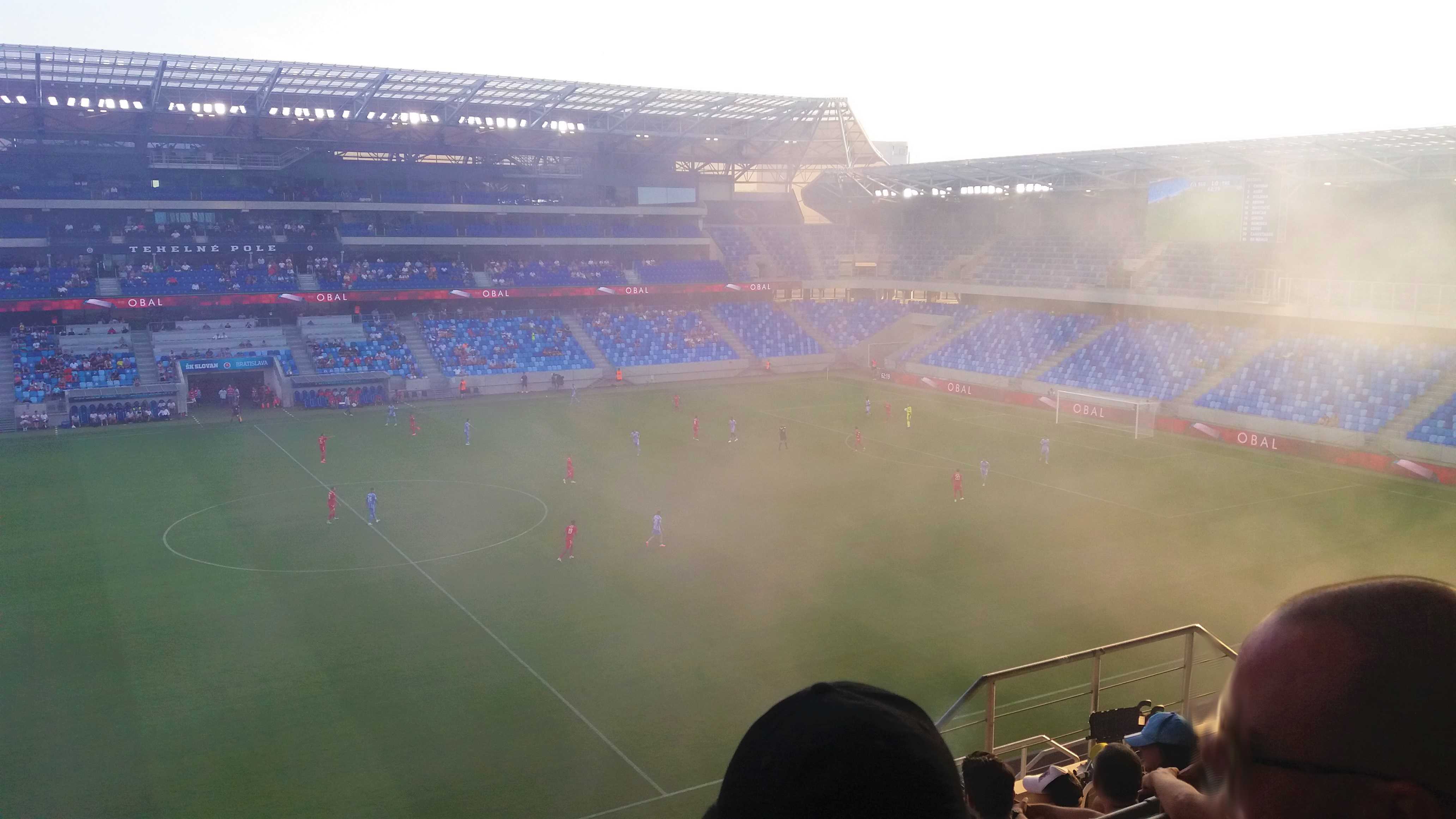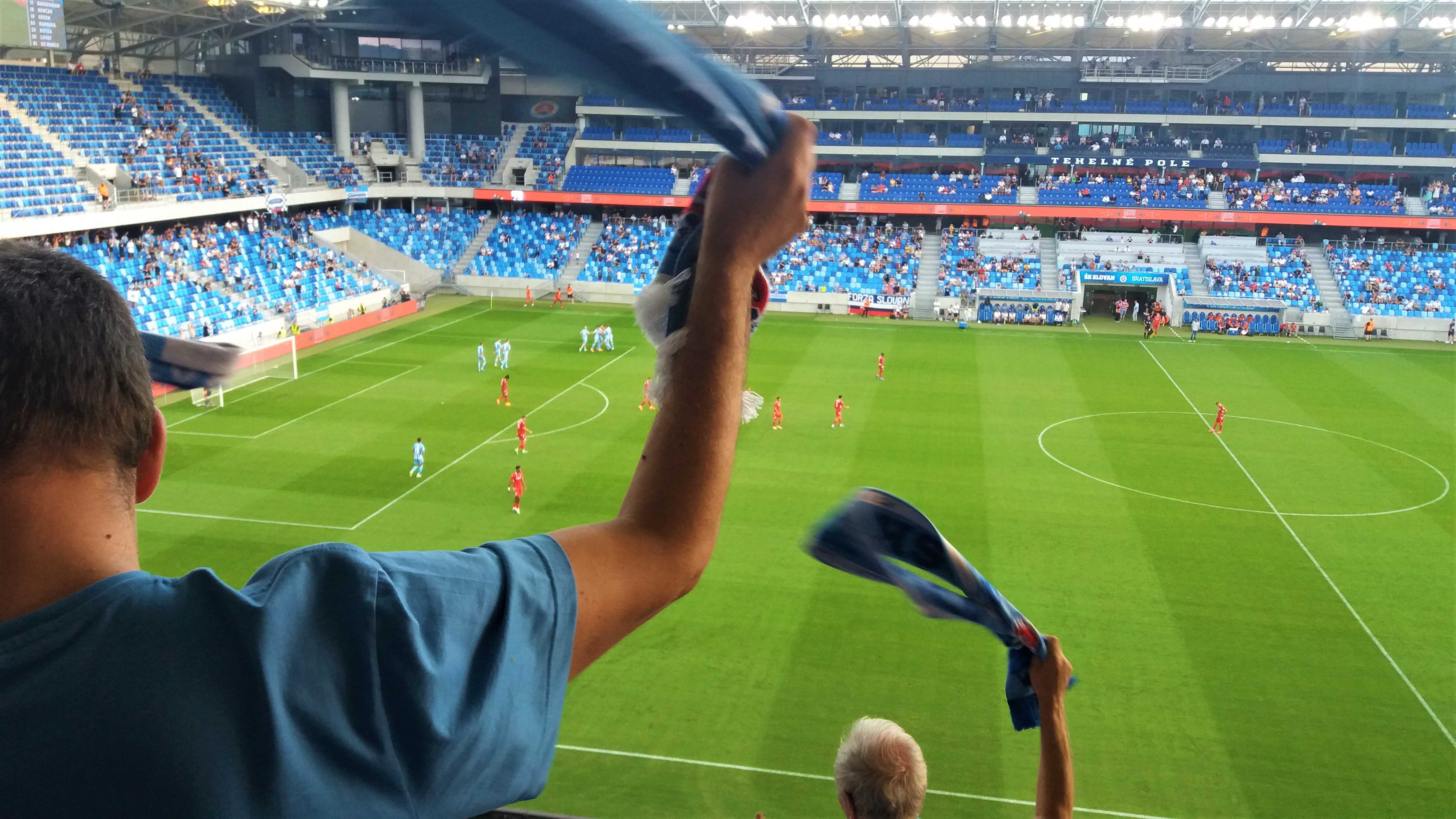 |  | | Na murawie dzieciaki trzymają flagi z historycznymi herbami Slovana (zwróćcie uwagę, że nikt się zbytnio nie przejmuje faktem, że na wielu z nich są motywy z czerwoną gwiazdą) z głośników leci hymn Slovana | |
