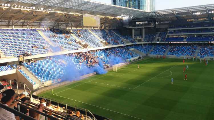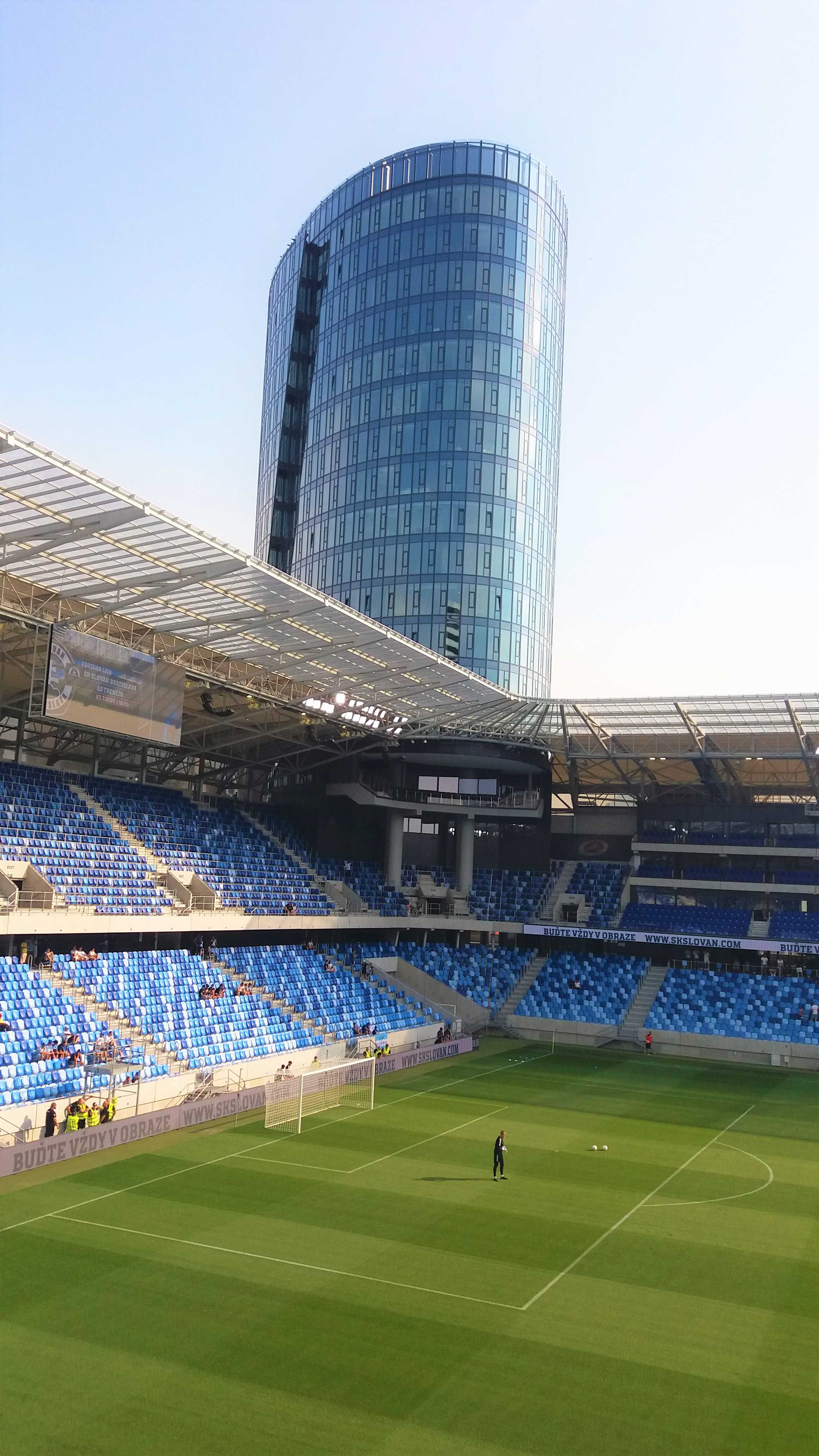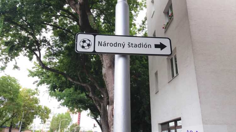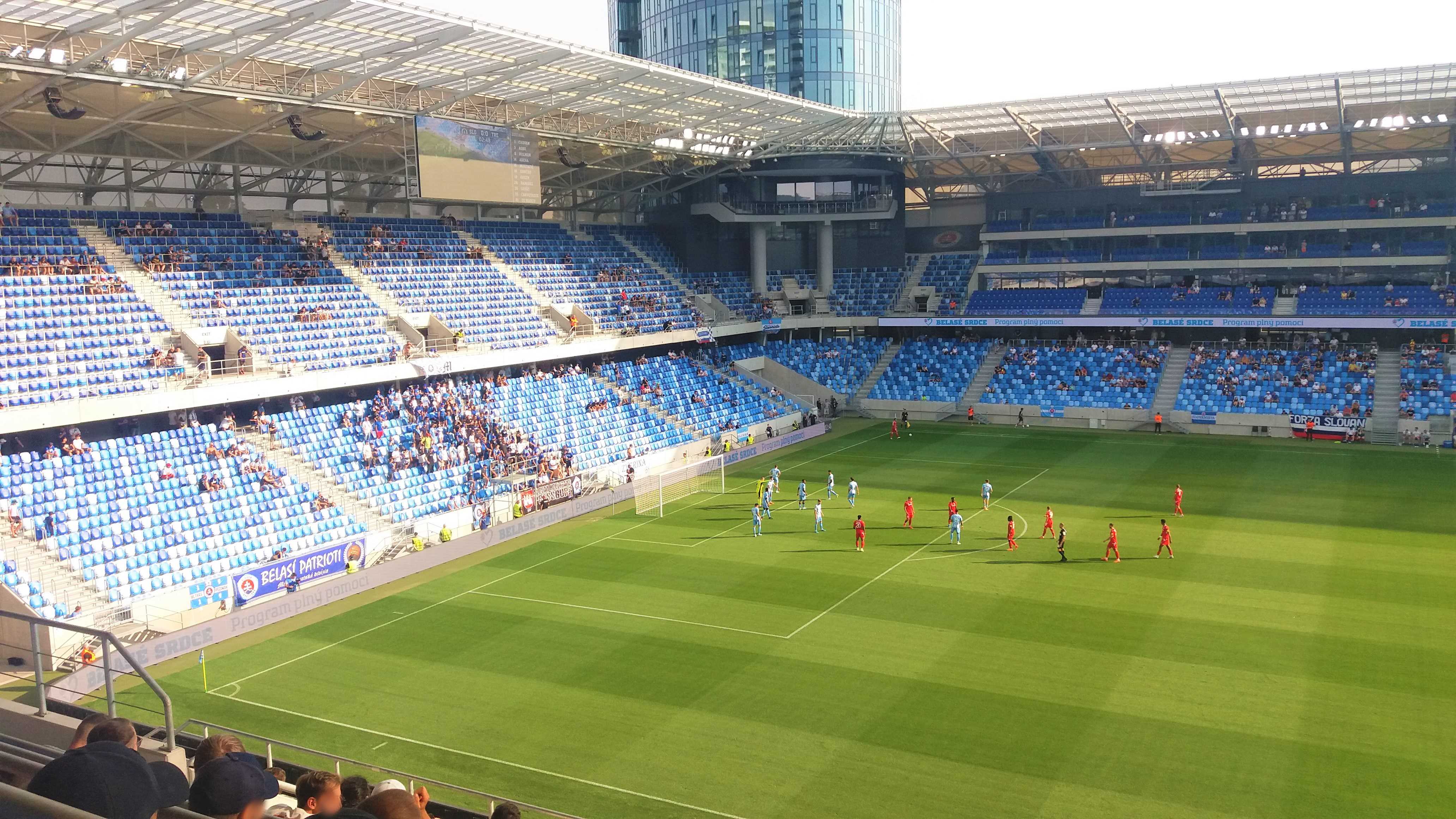 |  | | Na murawie dzieciaki trzymają flagi z historycznymi herbami Slovana (zwróćcie uwagę, że nikt się zbytnio nie przejmuje faktem, że na wielu z nich są motywy z czerwoną gwiazdą) z głośników leci hymn Slovana | |