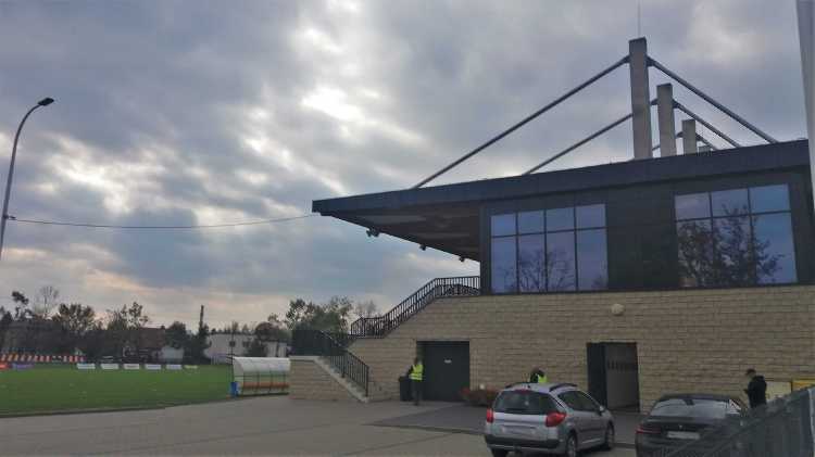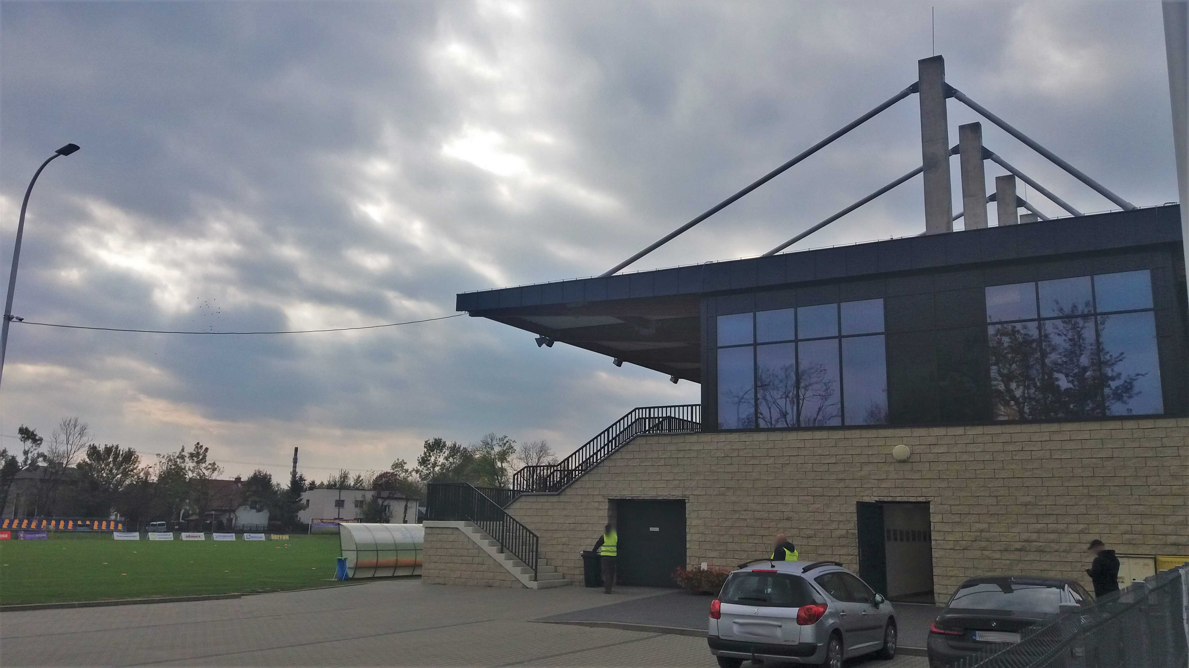 |  | | Główna trybuna stadionu z perspektywy wjazdu na parking | |