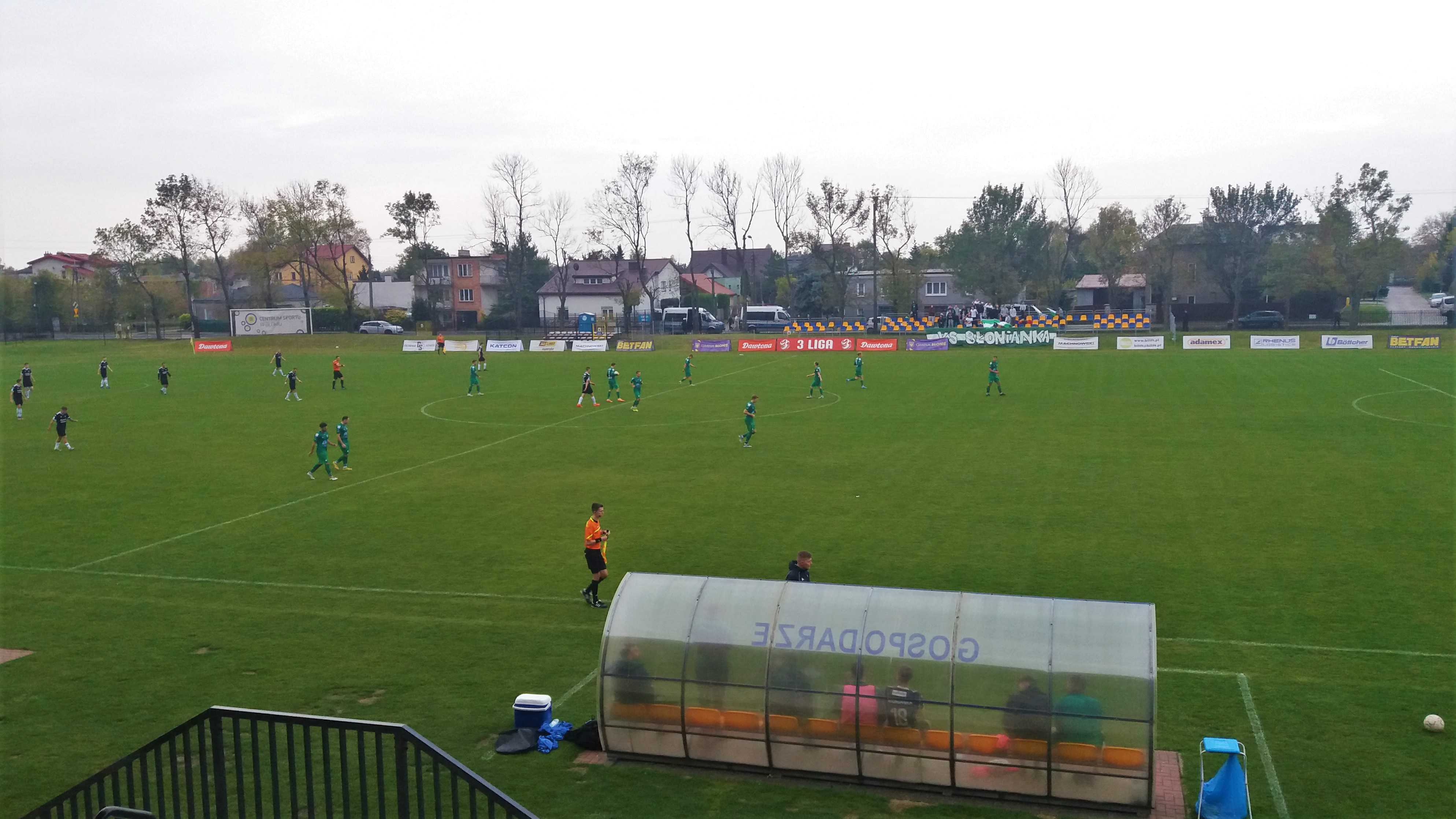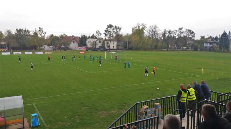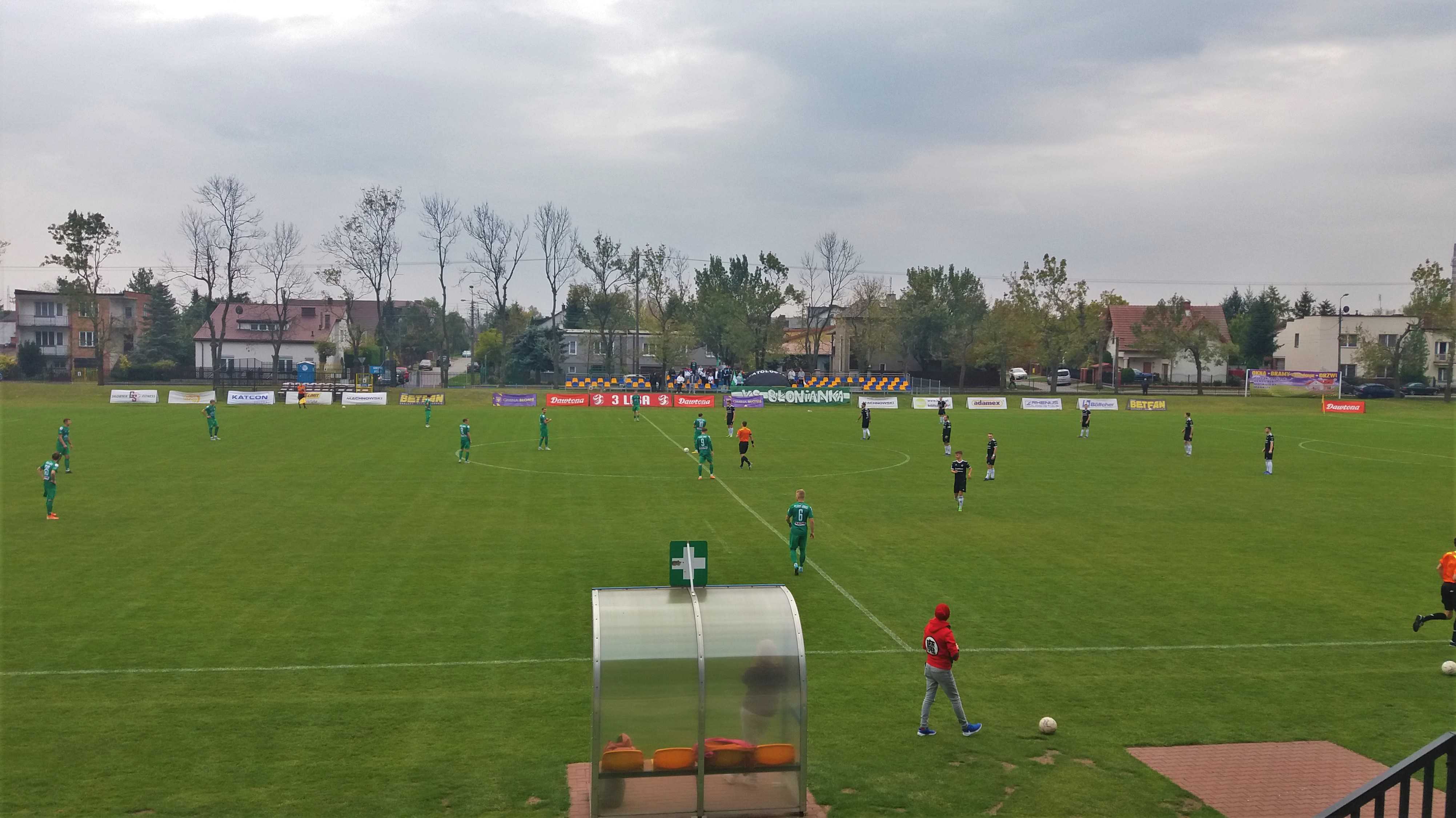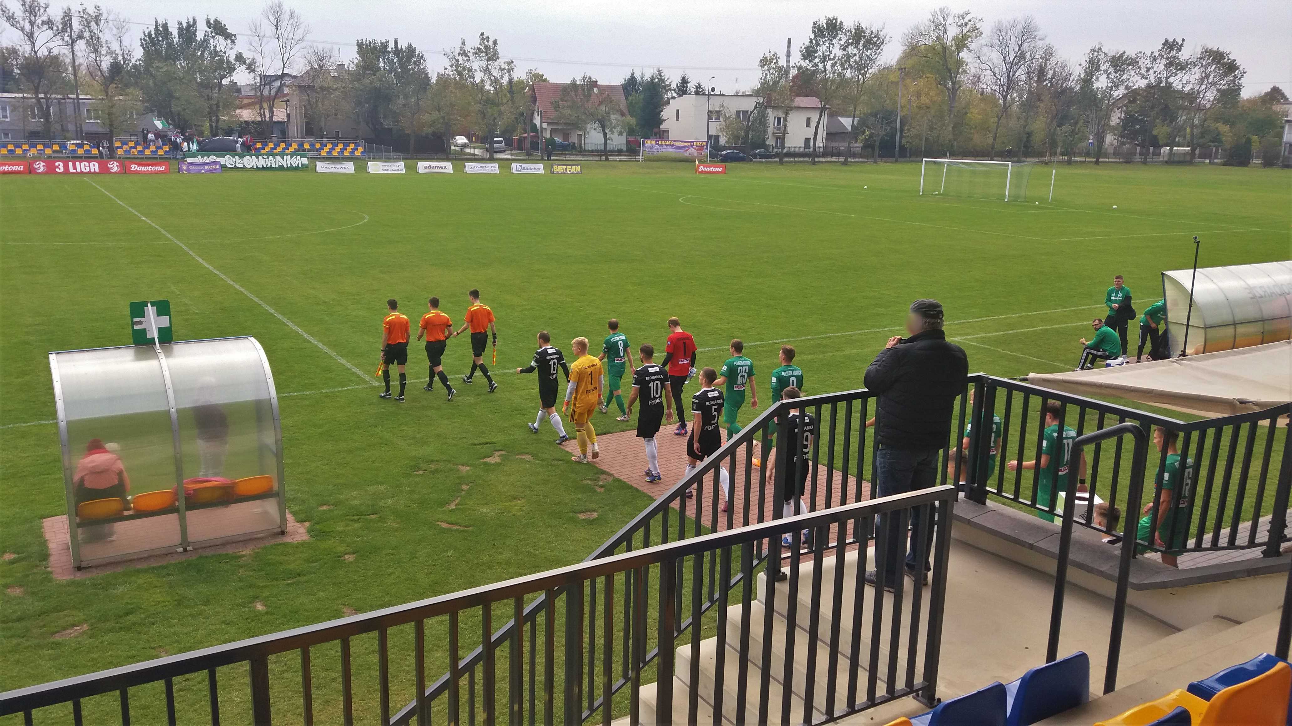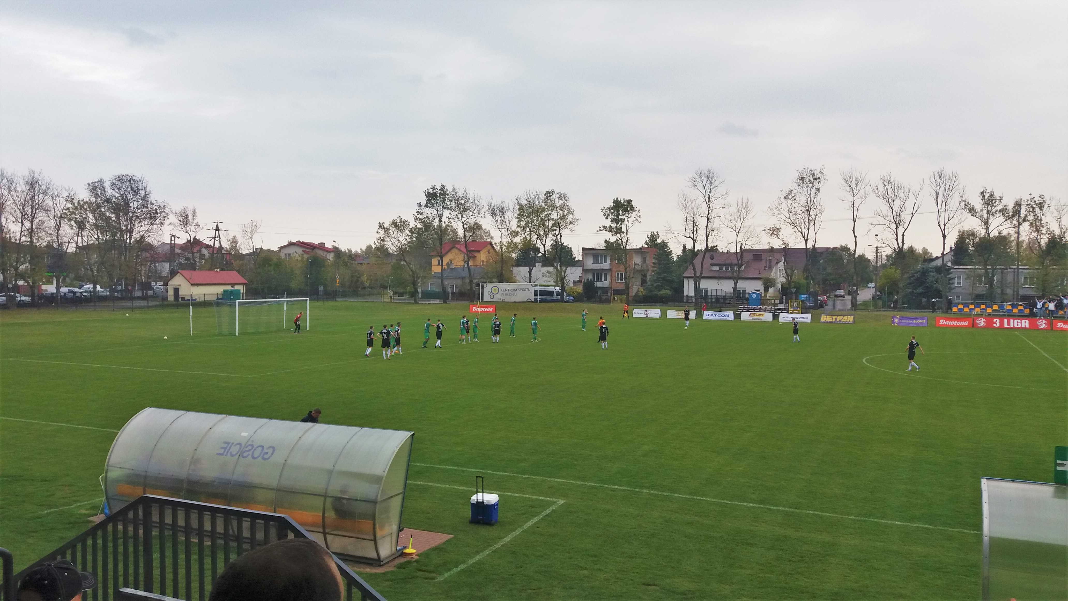 |  | | Gracze Blonianki wykonują rzut wolny, a boisko jest nadal daleko od trybuny | |