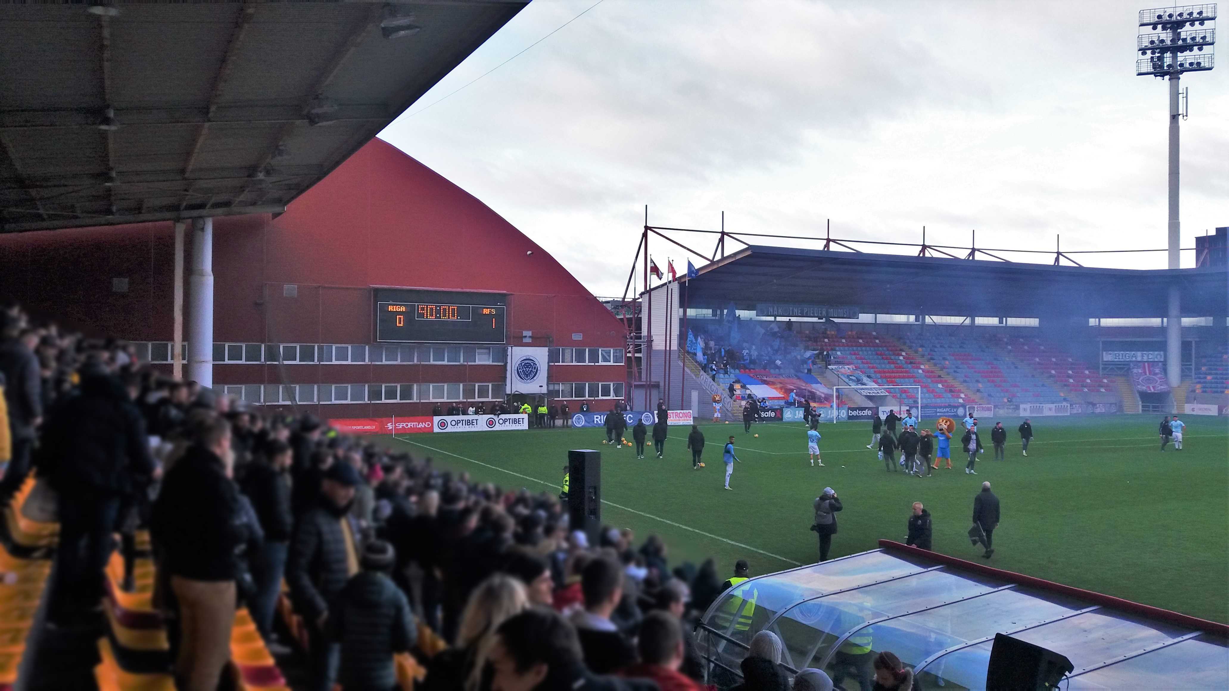 ![]() | Piłkarze są coraz bliżej, a stadionowy DJ uruchamia raz po raz armatki dymne (czy nie wiem jak to się nazywa) | |||