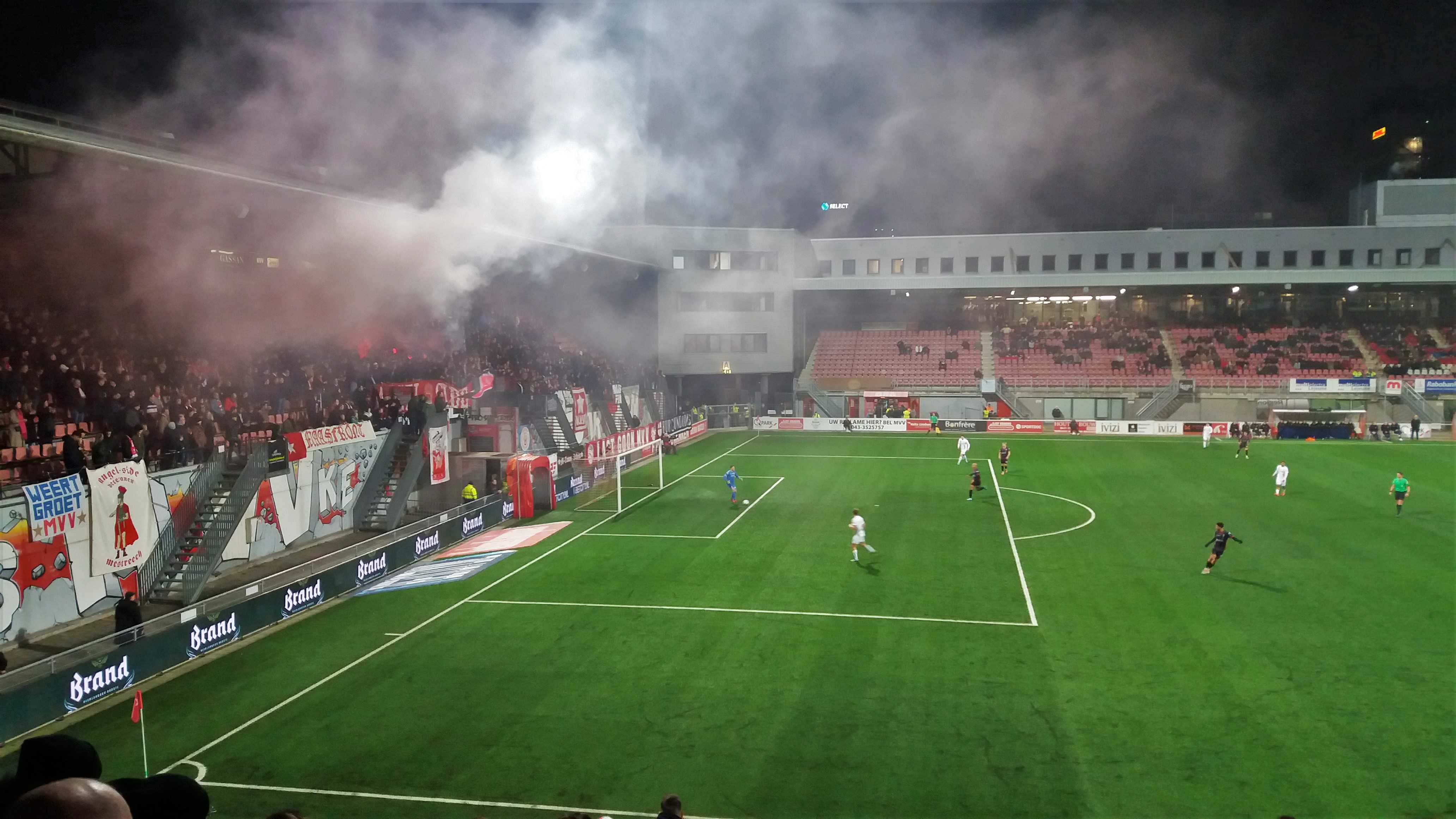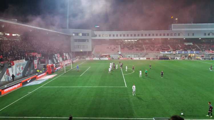 |  | | Rzut wolny dla TOP Oss; dym z rac jeszcze się nie rozwiał | |