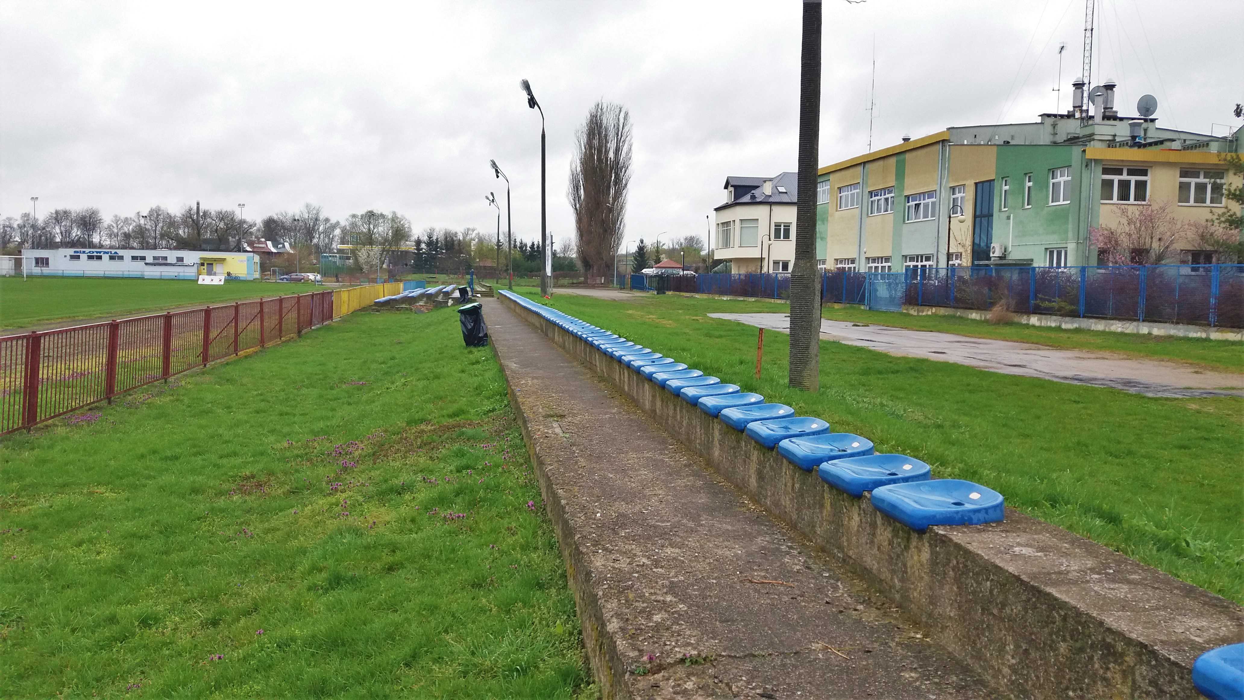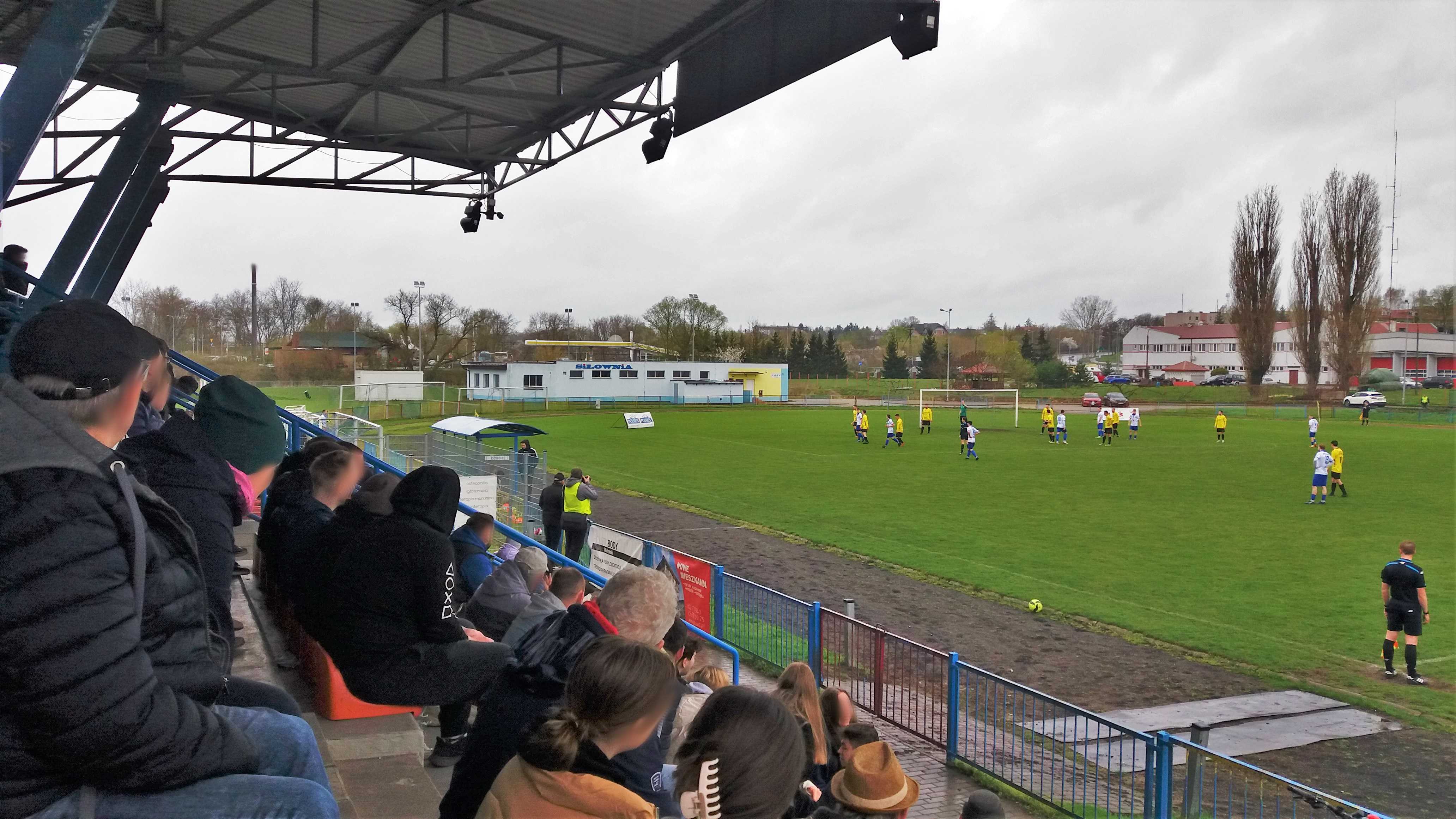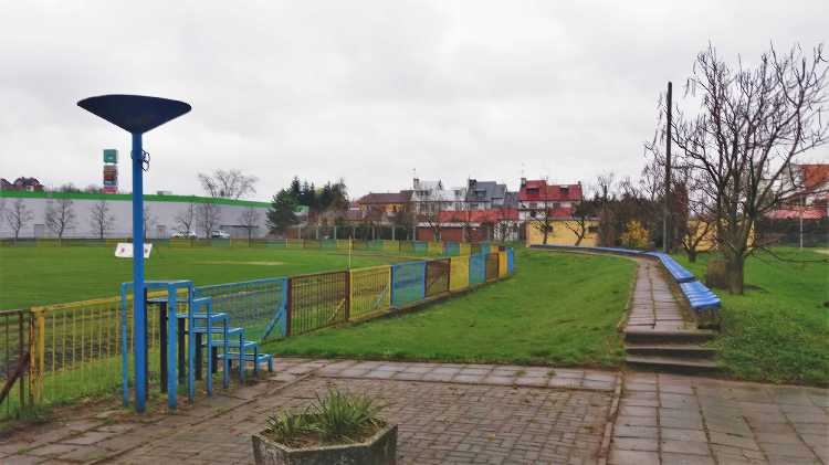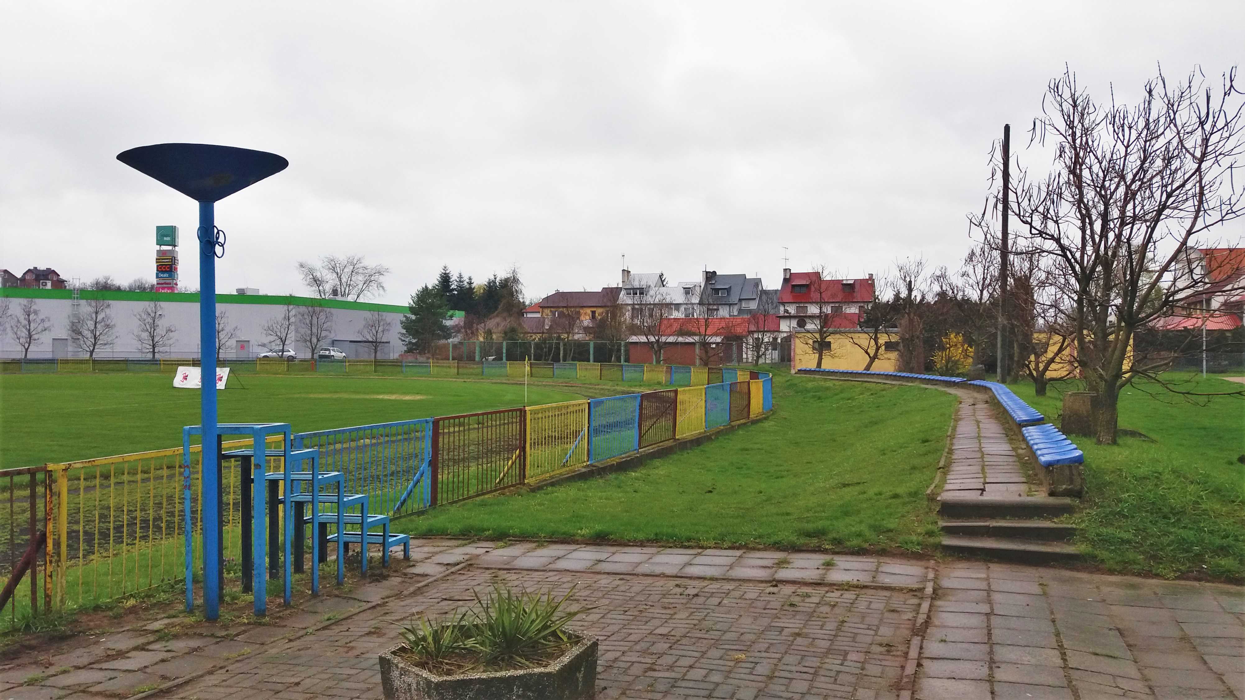 |  | | Widok wzdłuż linii bocznej boiska, jak żywcem wyjęty z PRL-u. Zwracam uwagę na przepiękną niebieską latarnię/znicz | |