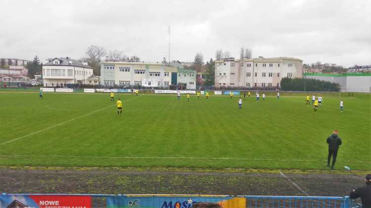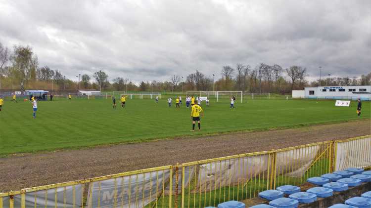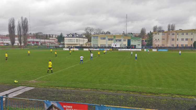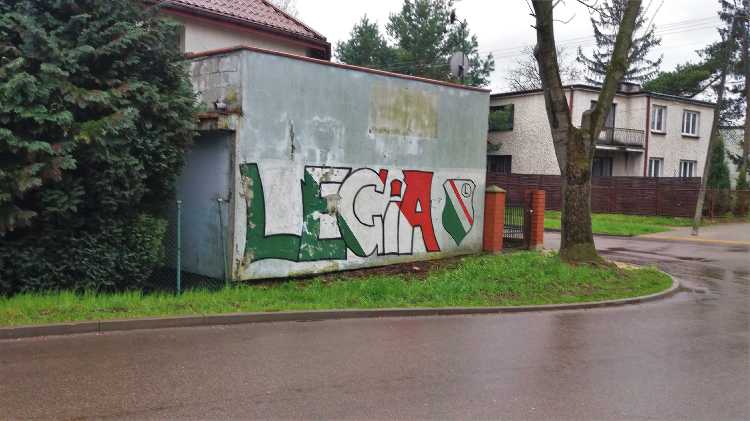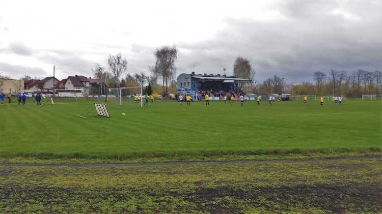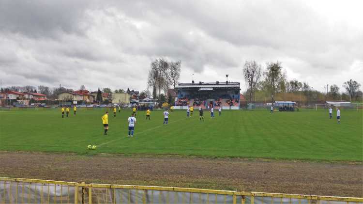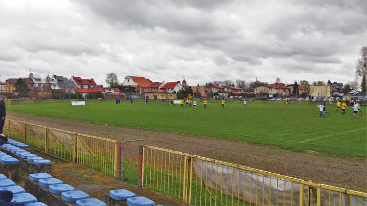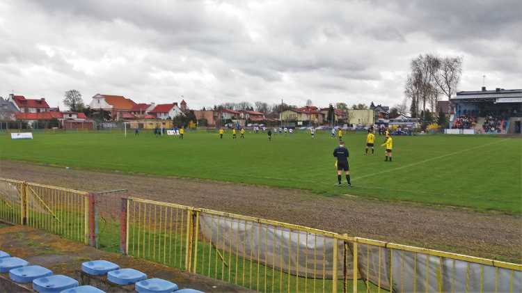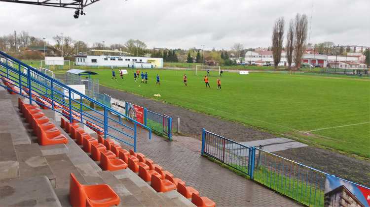 |  | | Widok wzdłuż linii bocznej boiska, jak żywcem wyjęty z PRL-u. Zwracam uwagę na przepiękną niebieską latarnię/znicz | |