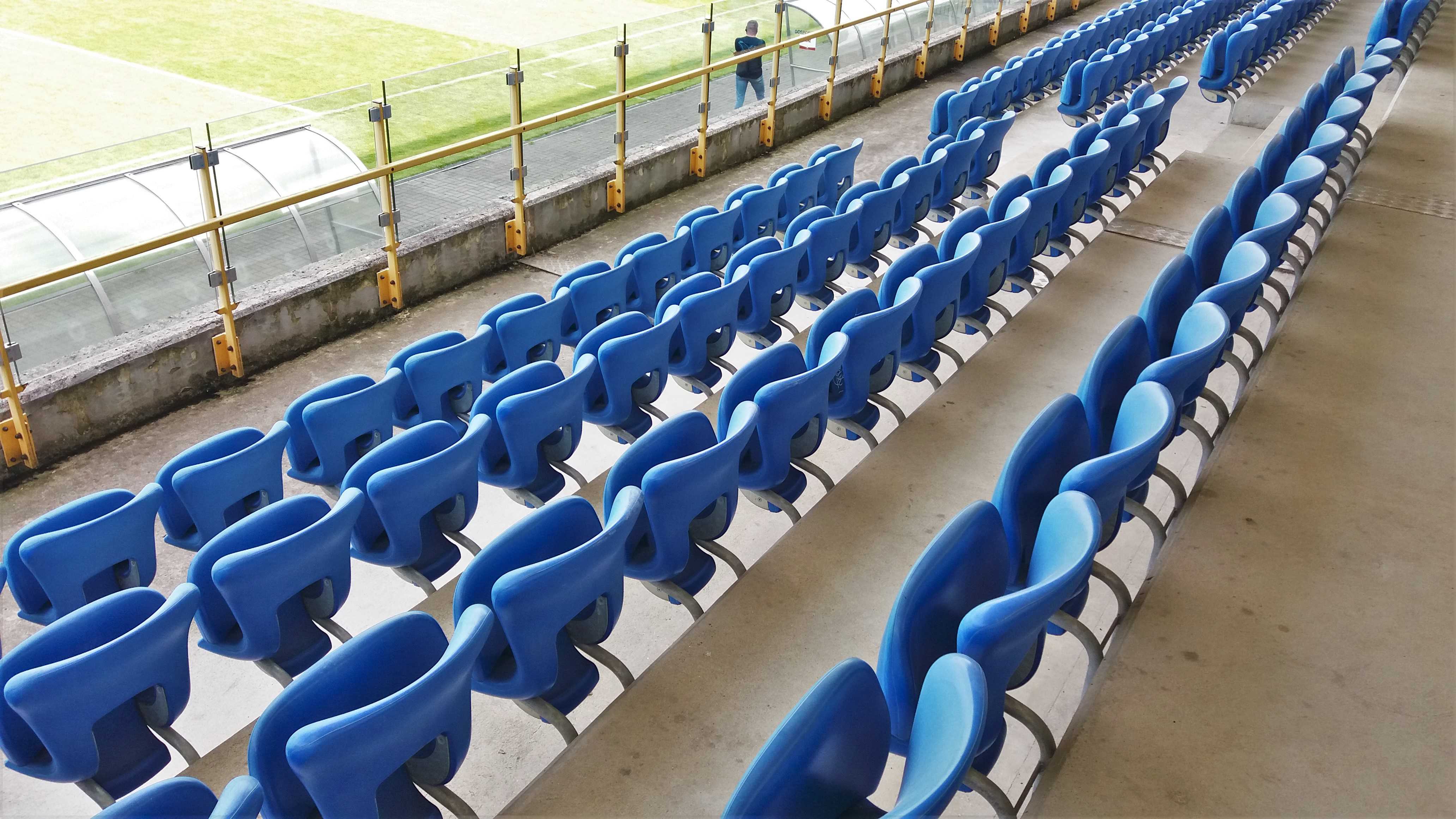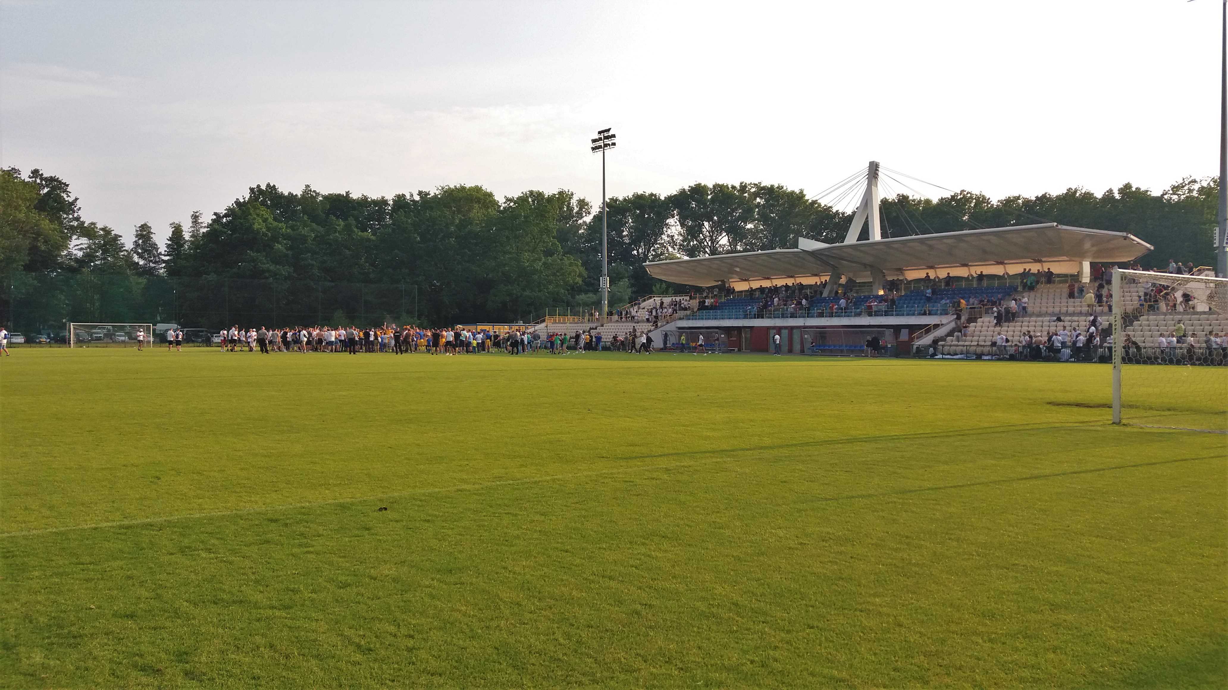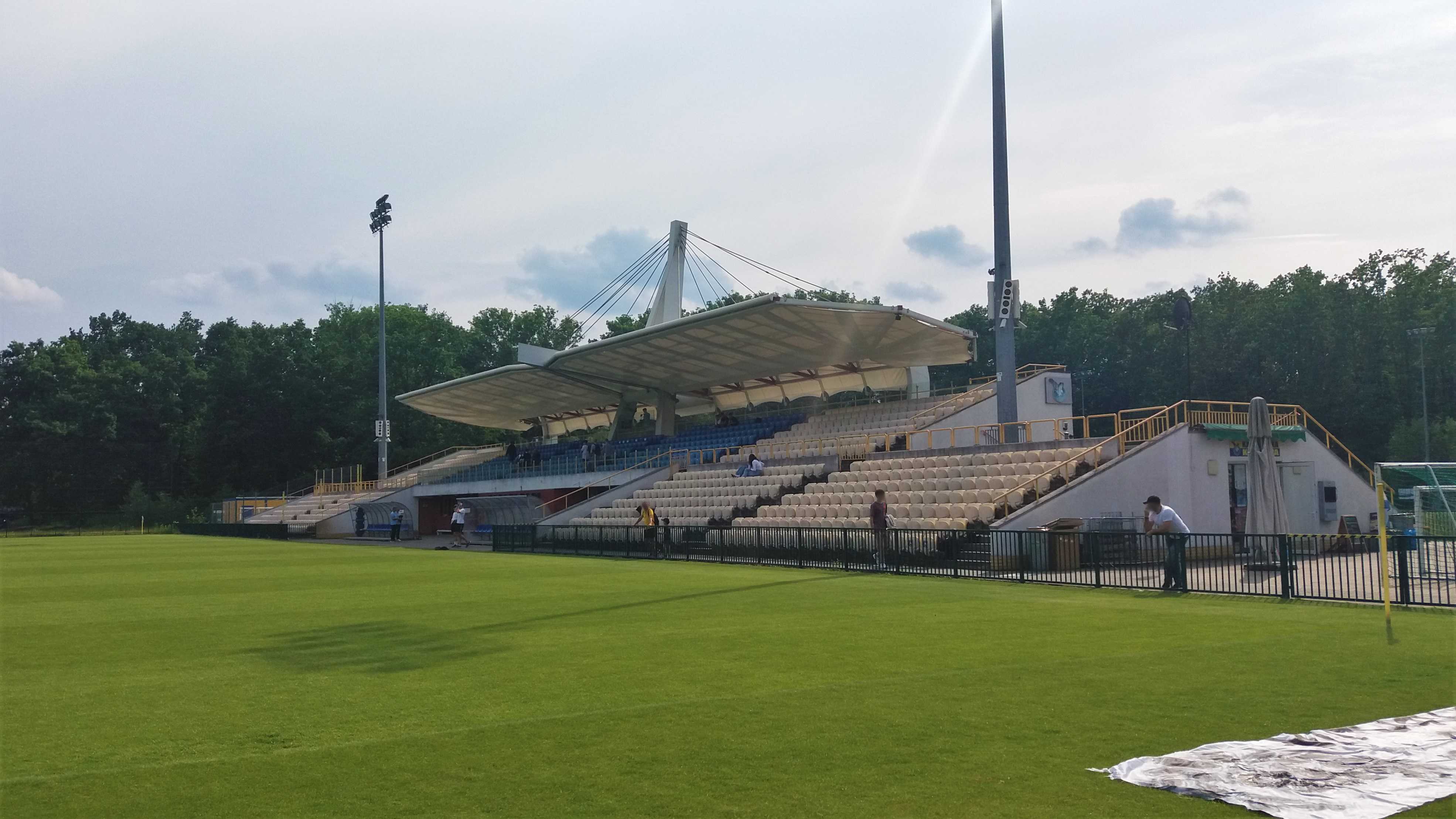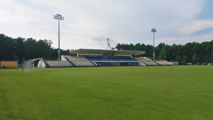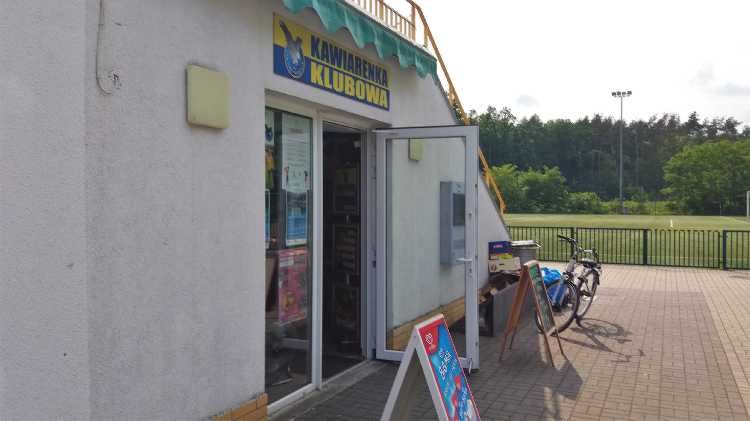 |  | | Trybuna stadionu w Sulejówku widziana zza ogrodzenia | |