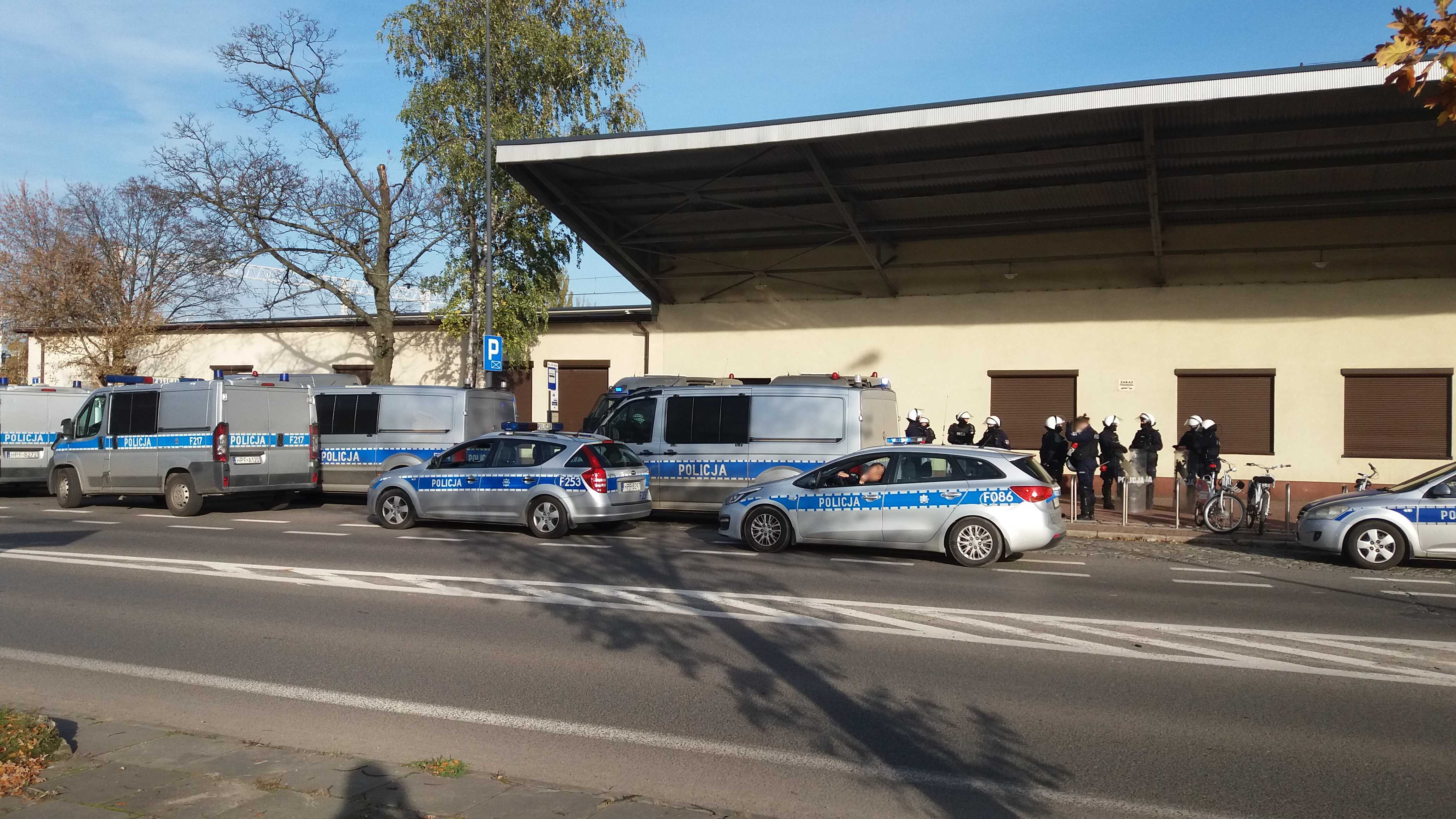 |  | | Zastępy Policji czekające na przyjazd kibiców Piasta | |
