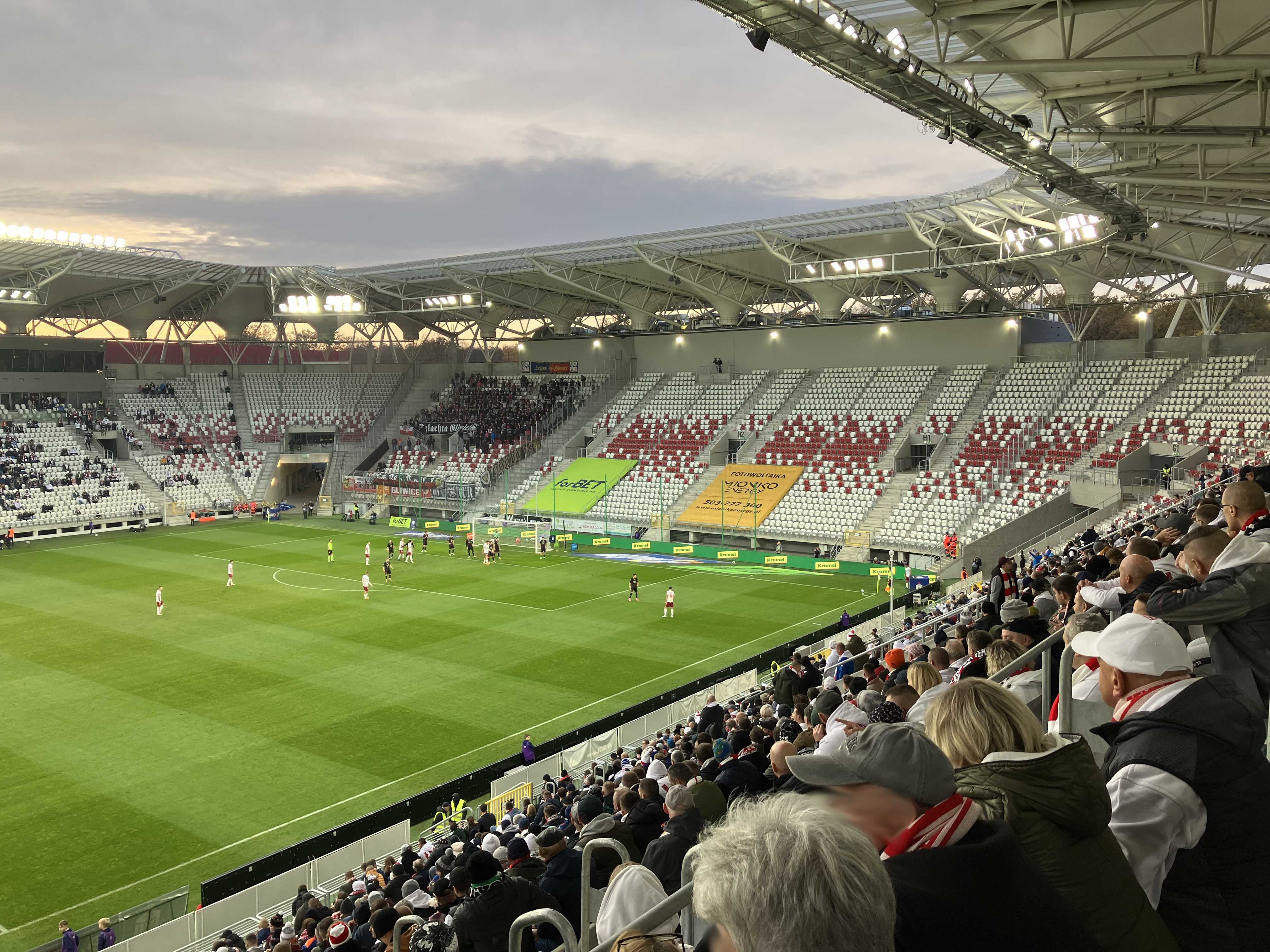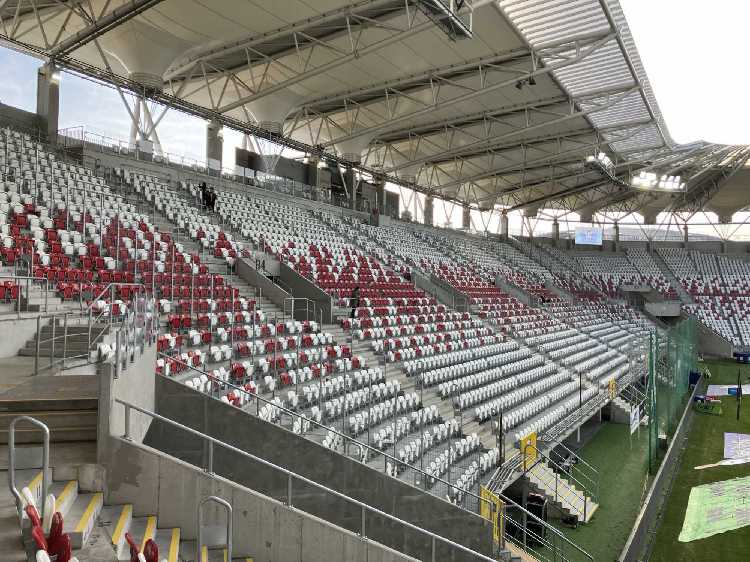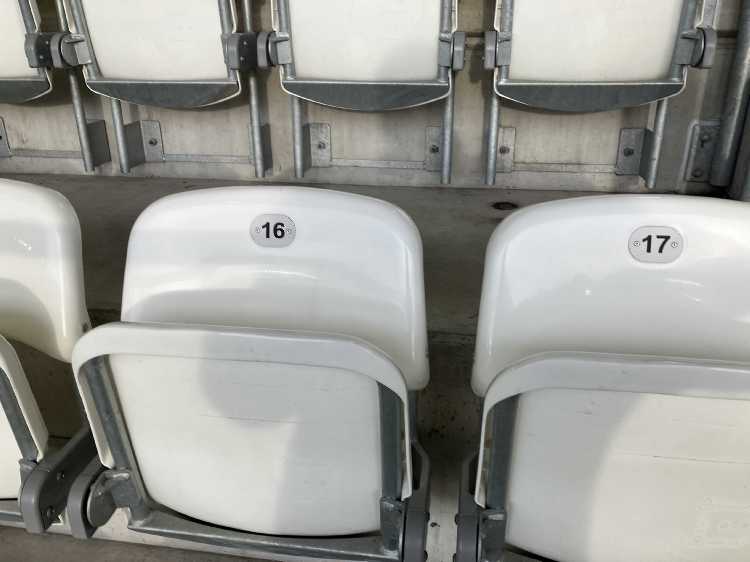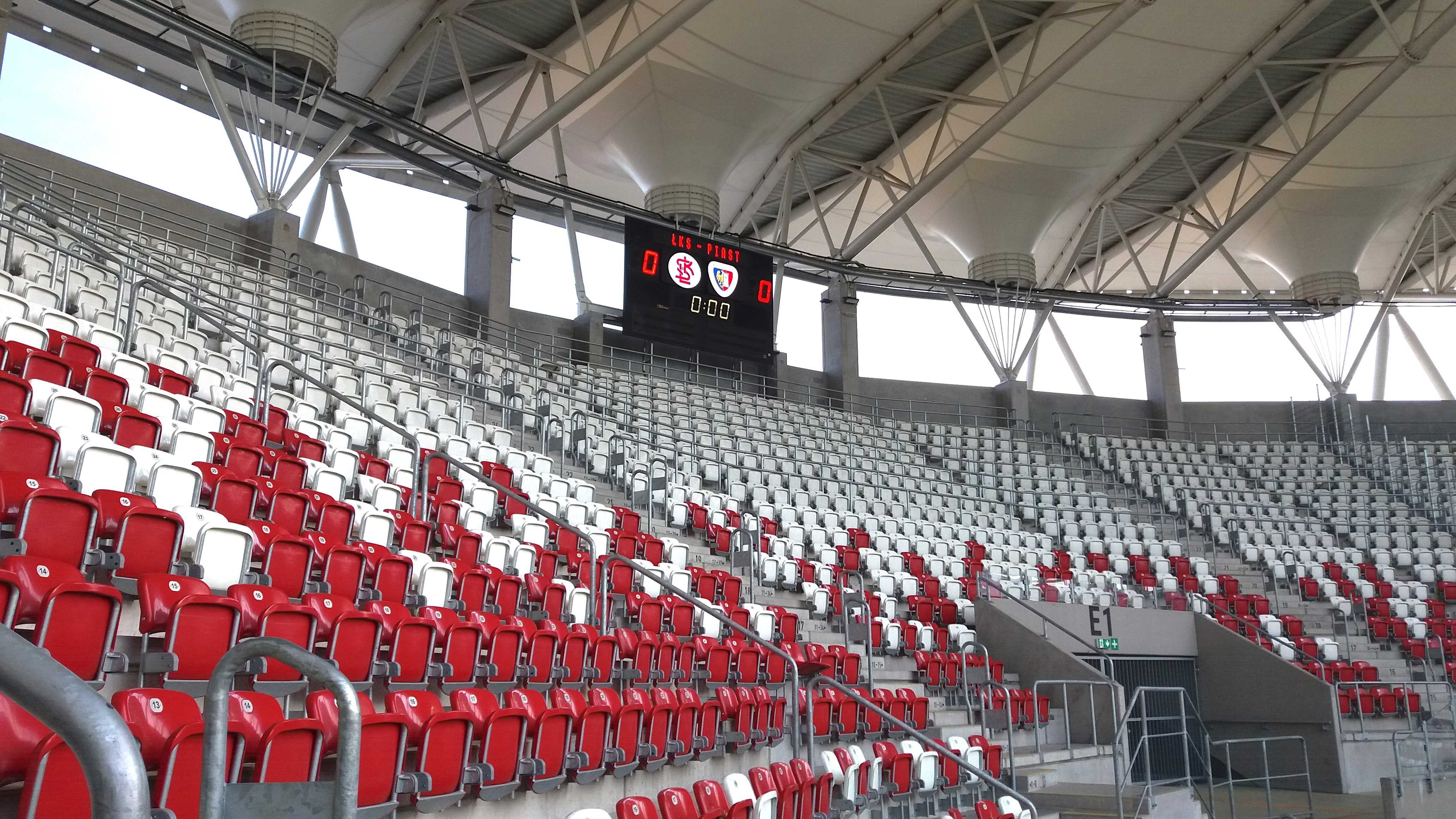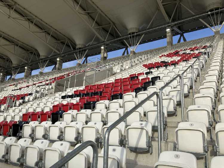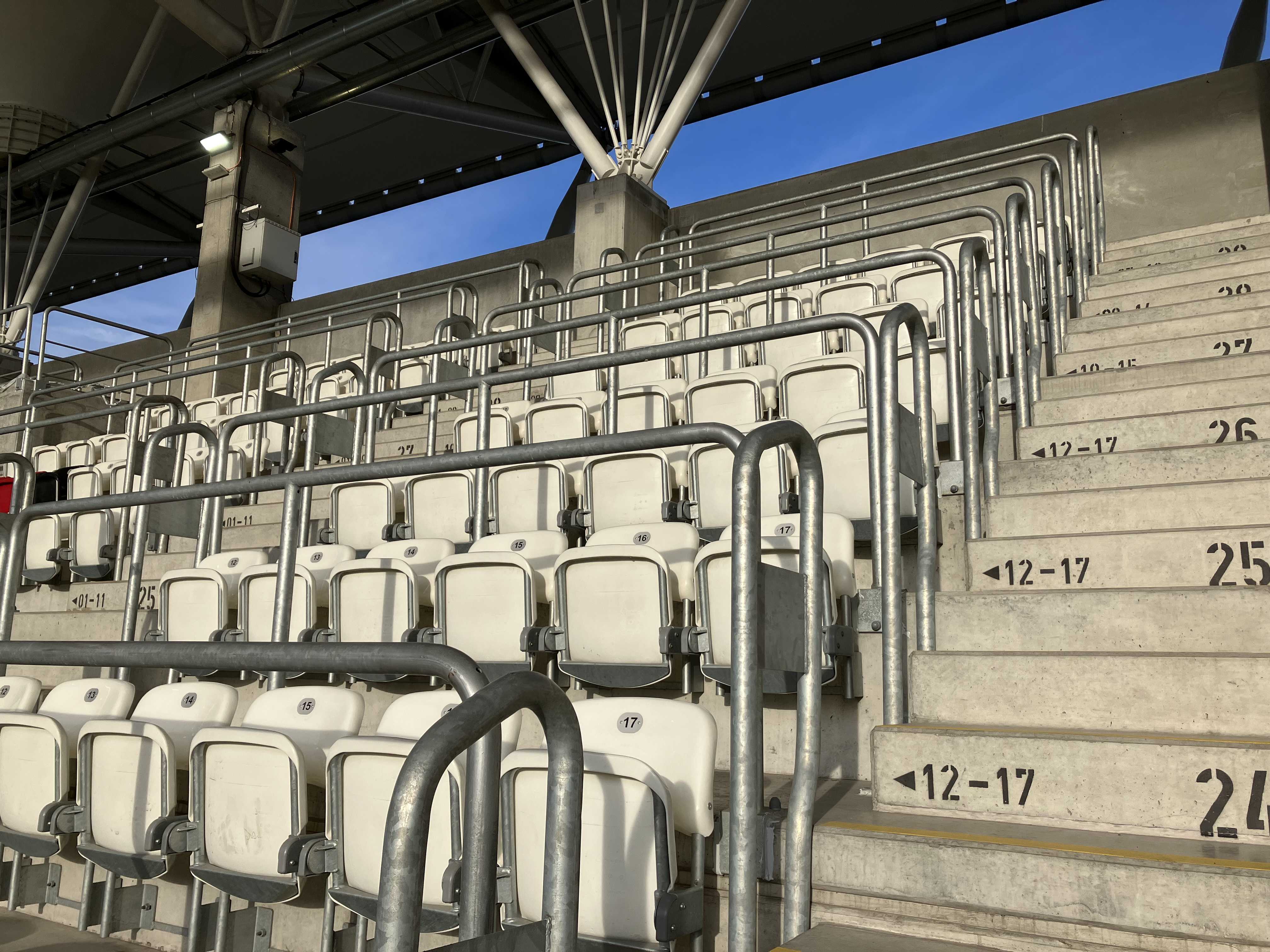 |  | | Na wysokich rzędach na trybunach znajdują się dodatkowe barierki, zabezpieczające przed wypadnięciem (?) | |