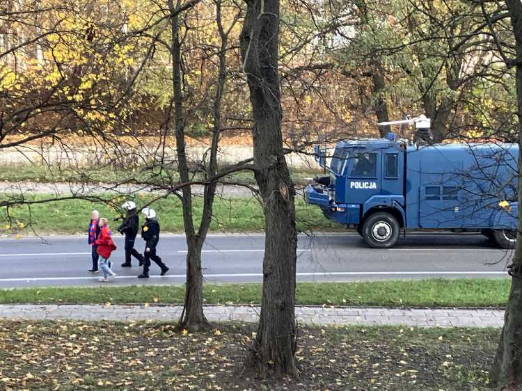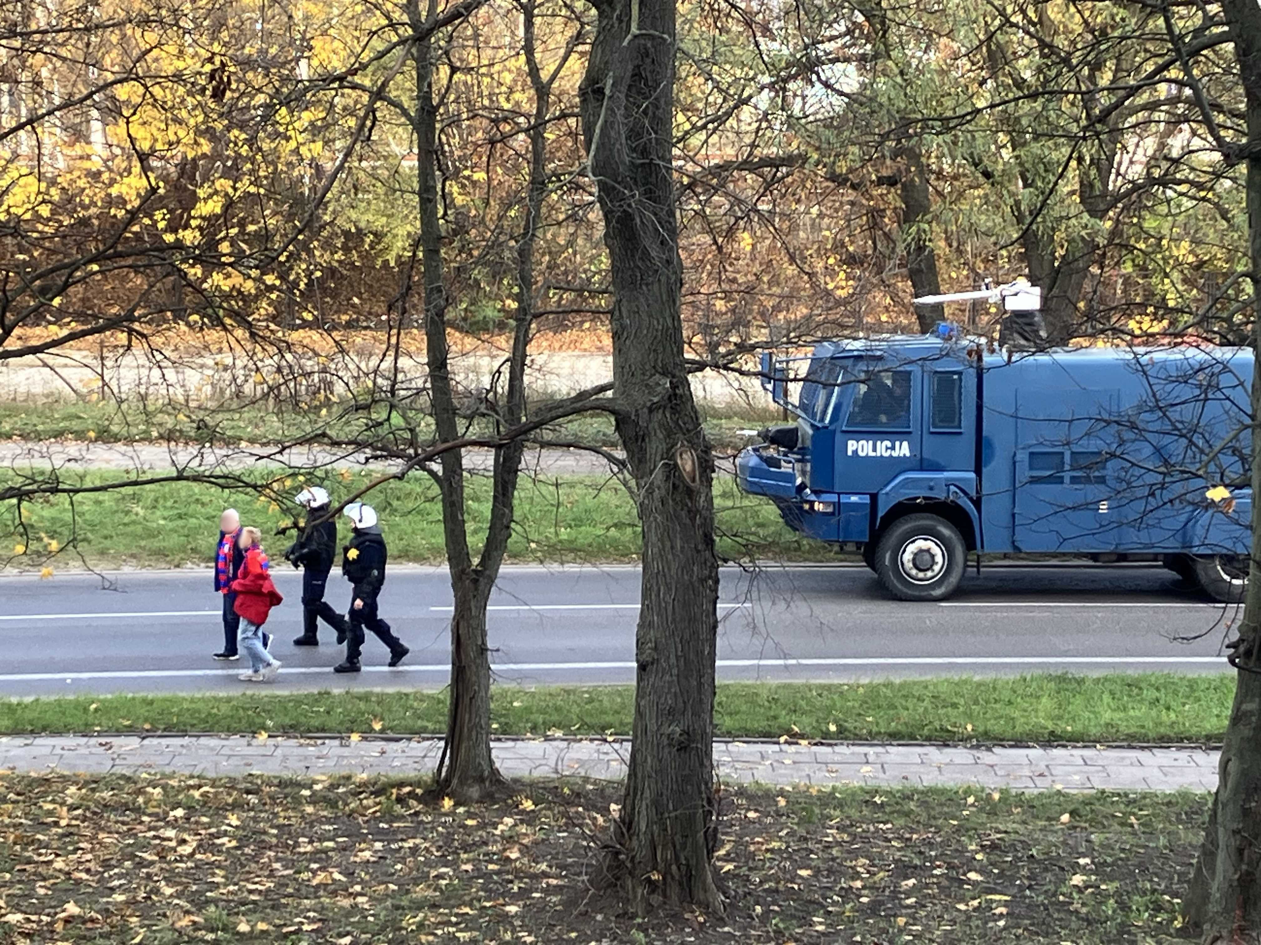 |  | | Polewaczka i białe kaski pilnujące największych zadymiarzy | |