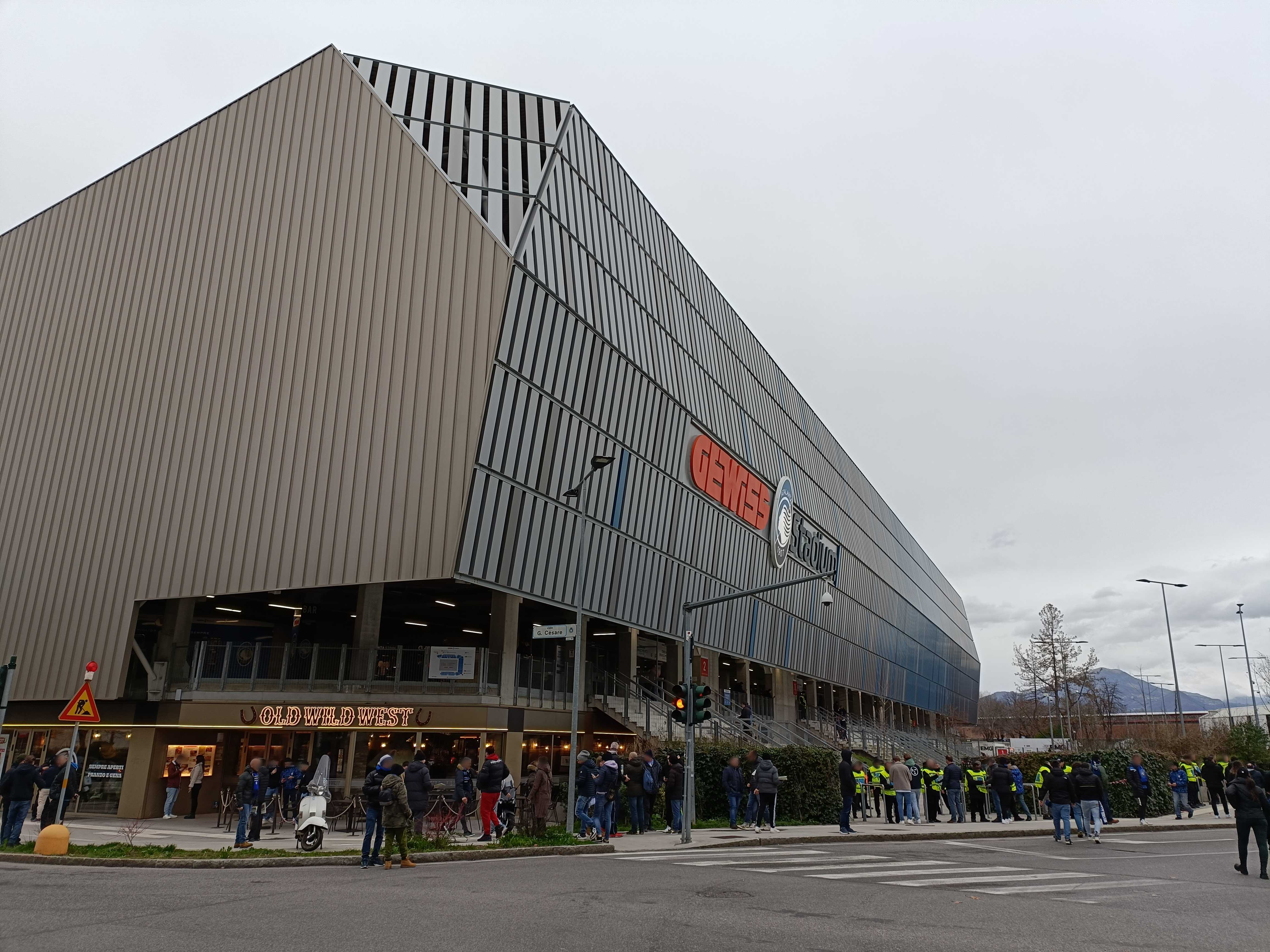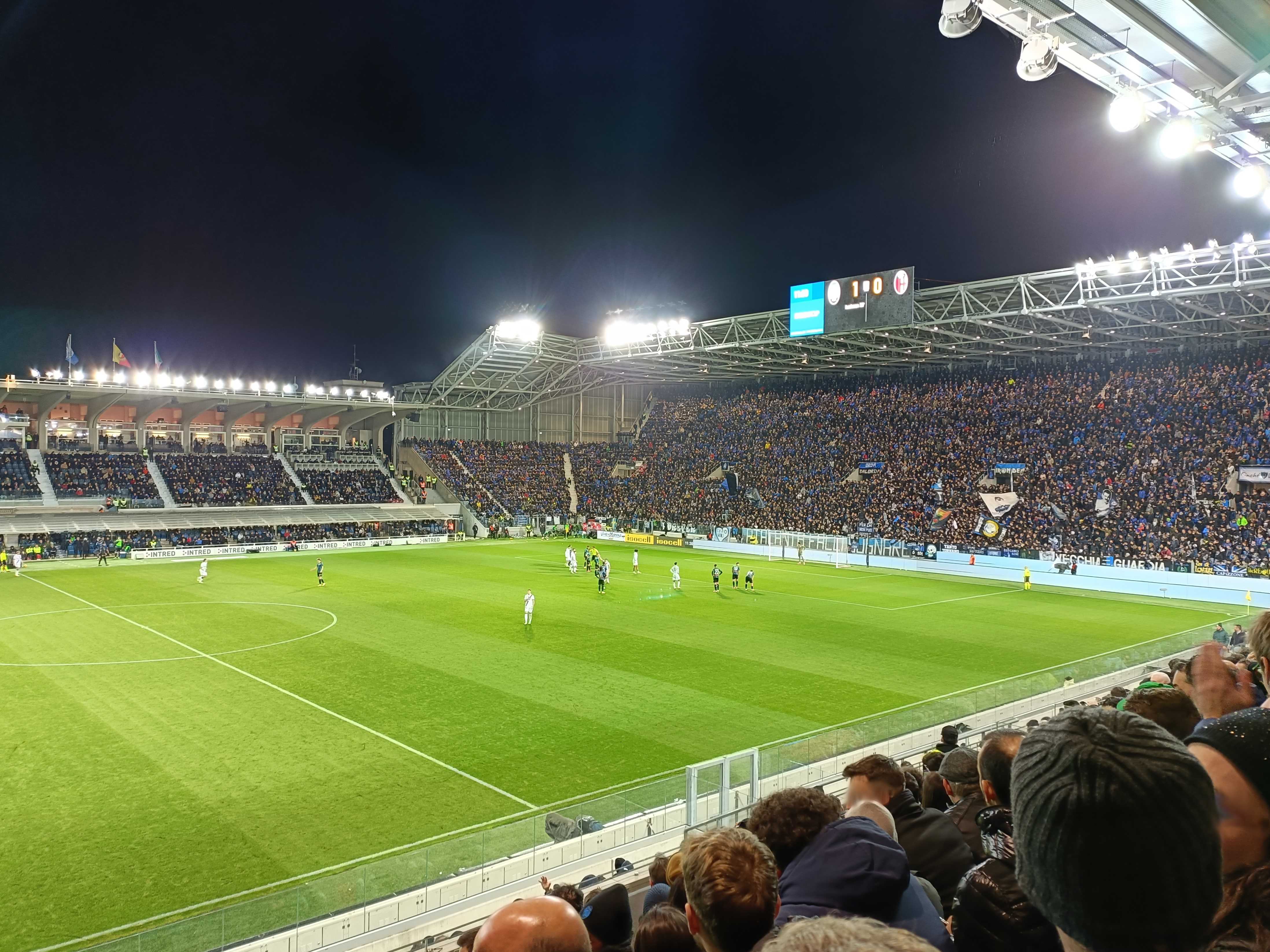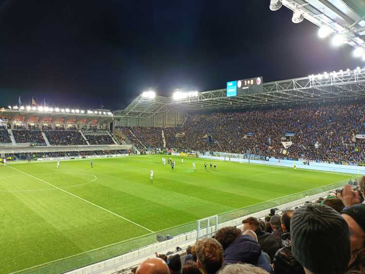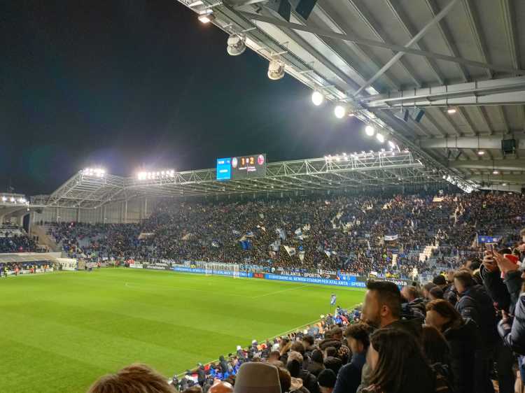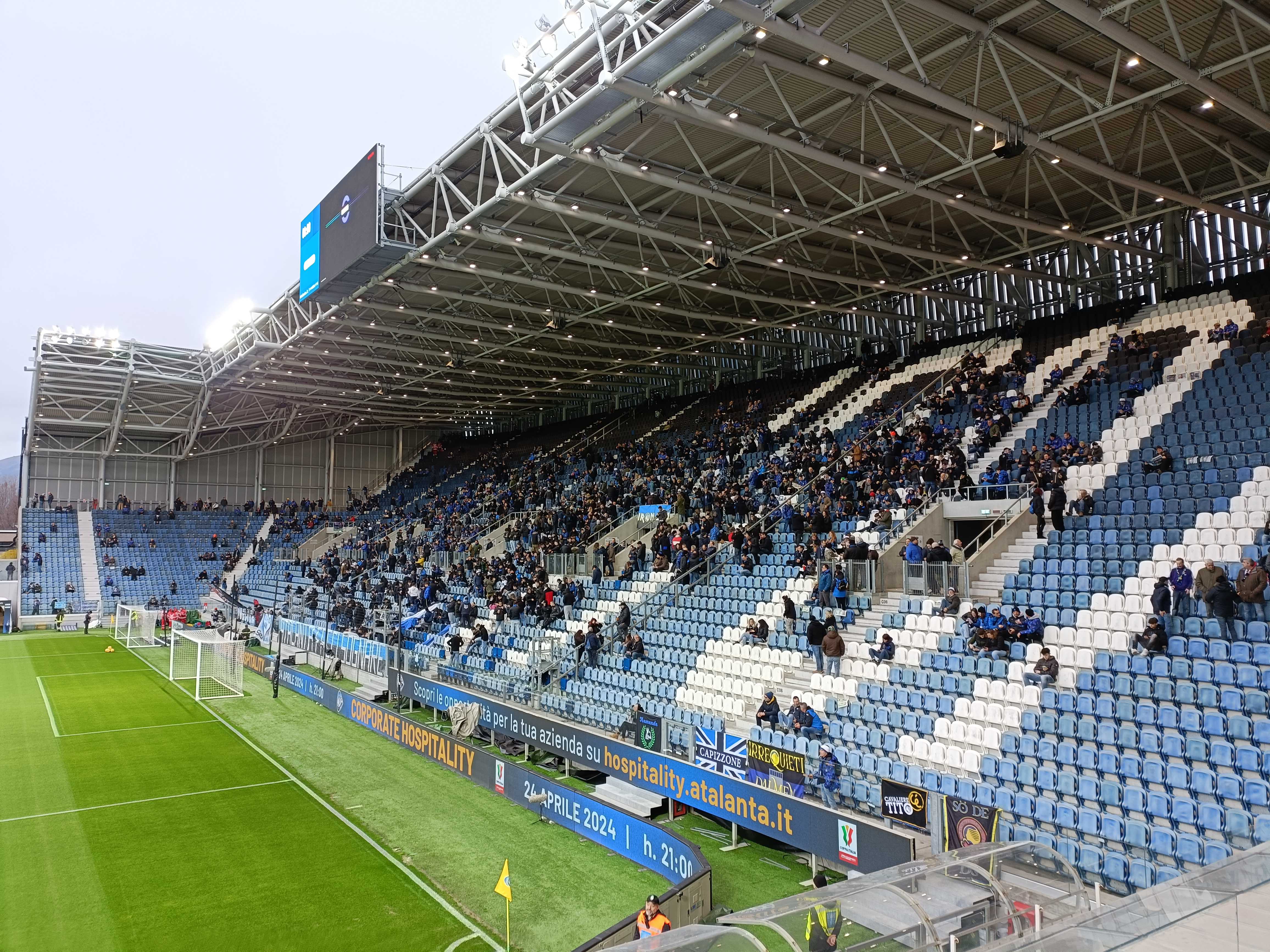 |  | | Piłkarze Atalanty walą głową w mur; przy okazji, widać kibiców gości w swoim sektorze | |