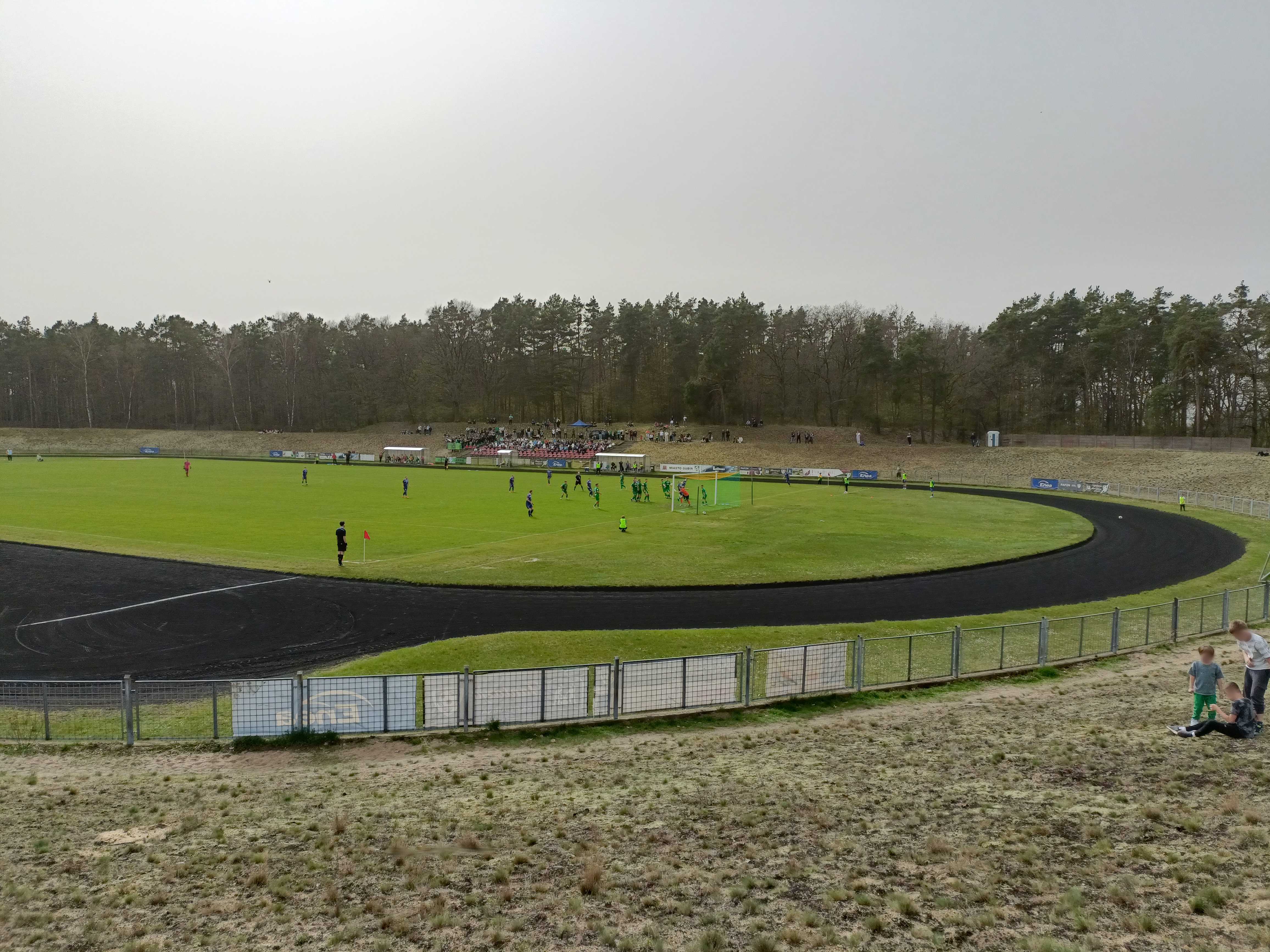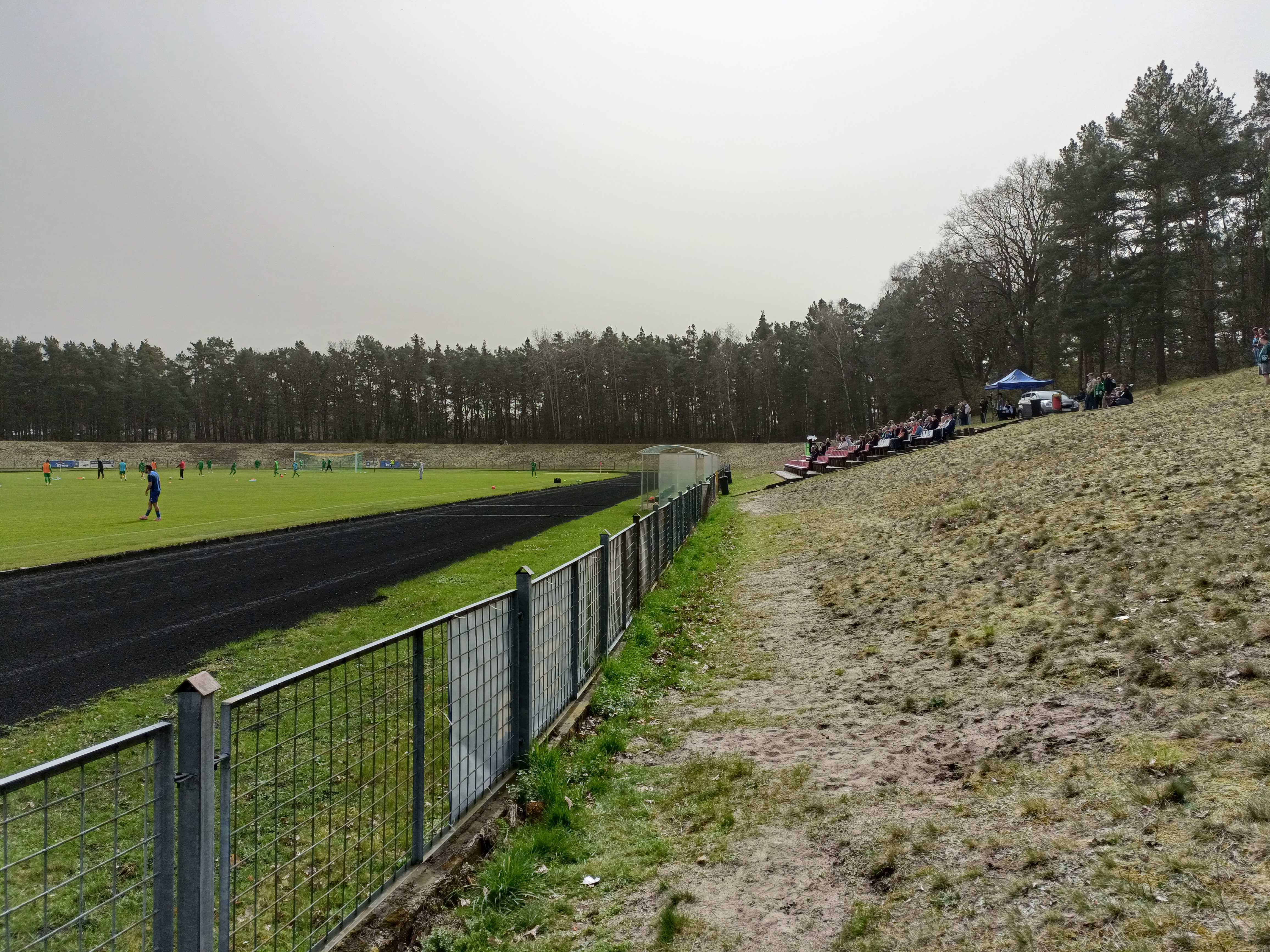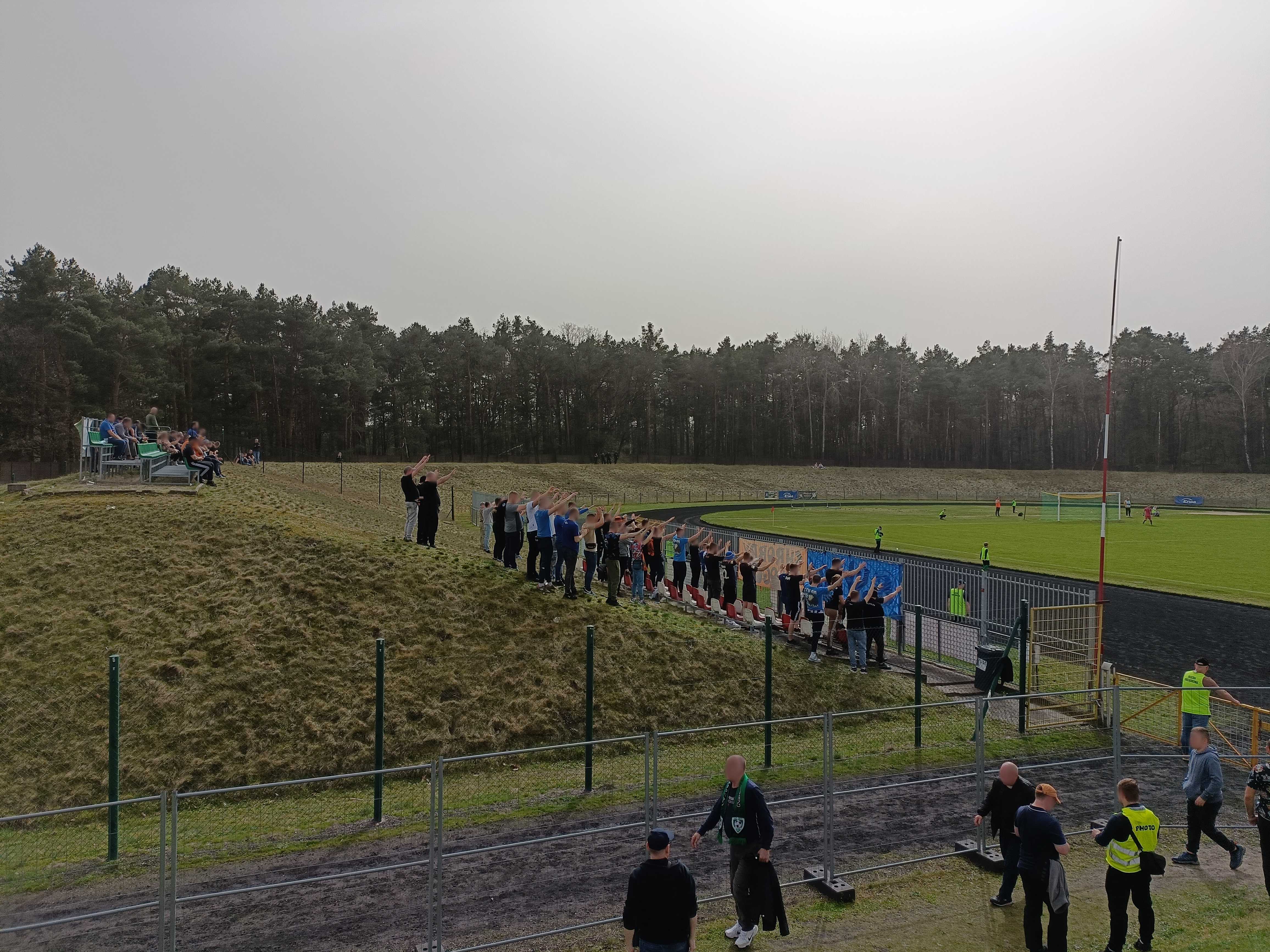 |  | | Kibice kryją się pod sektorówką, co wygląda dość pociesznie na takiej małej trybunce | |